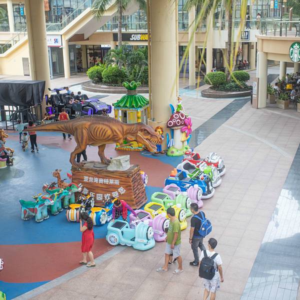 在海边玩闹了一阵,大家就到亚龙湾壹号小镇·奥特莱斯购物,据闺蜜讲,上次她来三亚,在奥特莱斯买了很多便宜又实用的小玩意,所以我们还是蛮有兴趣的。这几年全国各地到处都在搞特色小镇,但搞好的真的是凤毛麟角。亚龙湾的这座奥特莱斯和别的城市奥特莱斯大大不同,之前去过的奥特莱斯大都是折扣店+少量餐饮。但是亚龙湾壹号小镇·奥特莱斯设计理念和规模都与众不同,所以这里也是三亚非常热门的一处旅游地。目前,整个奥特莱斯一共有200多个国际国内知名品牌入驻,其中有很多品牌都是首次入驻海南,全年提供1-7折的折扣,不出岛也可以优惠,所以慕名而来的游客很多。来到奥特莱斯,除了各种各样的门店外,还有小水池、热带植物和水景大道等等景观,看起来还真是蛮赏心悦目的。值得一提的是,在奥特莱斯里,还有一处儿童乐园。这里有仿真恐龙、急速飞车、动力小火车等等,足够满足各种儿童的兴趣。