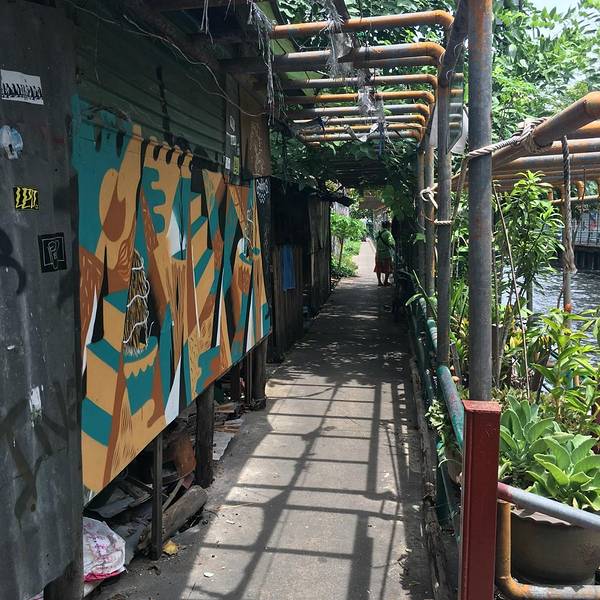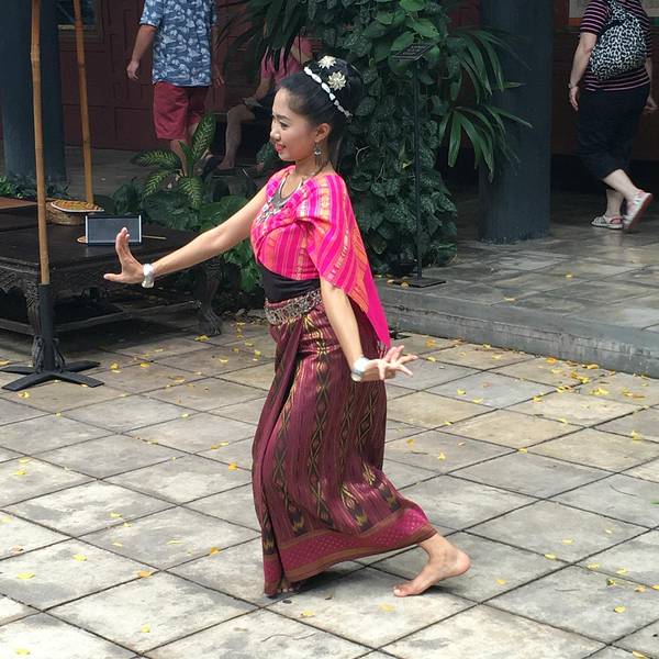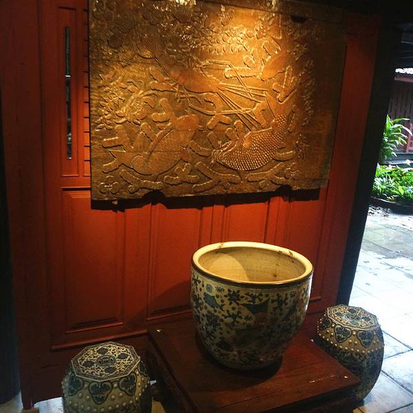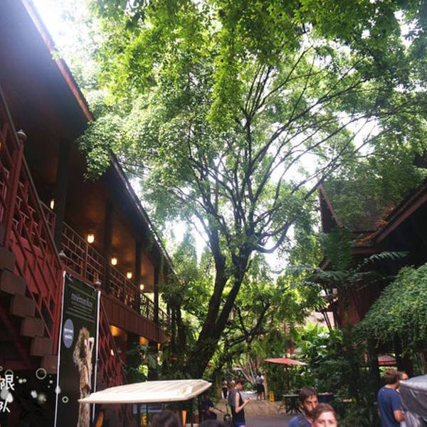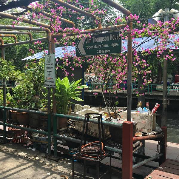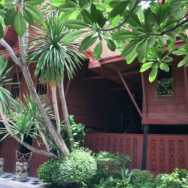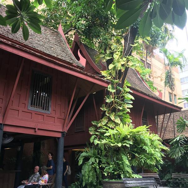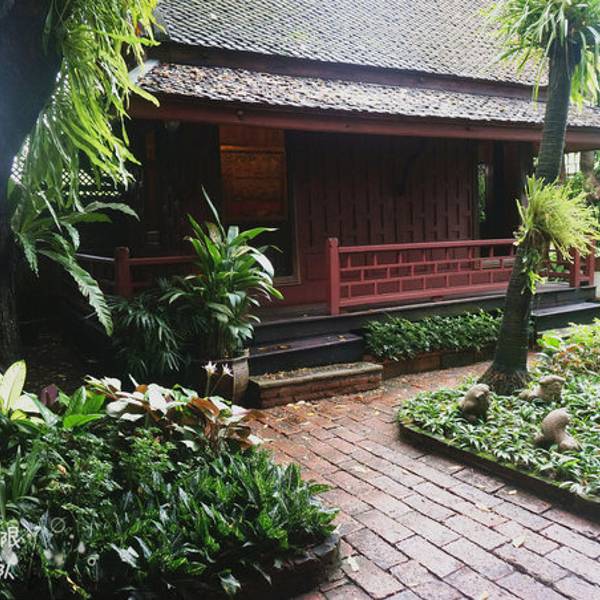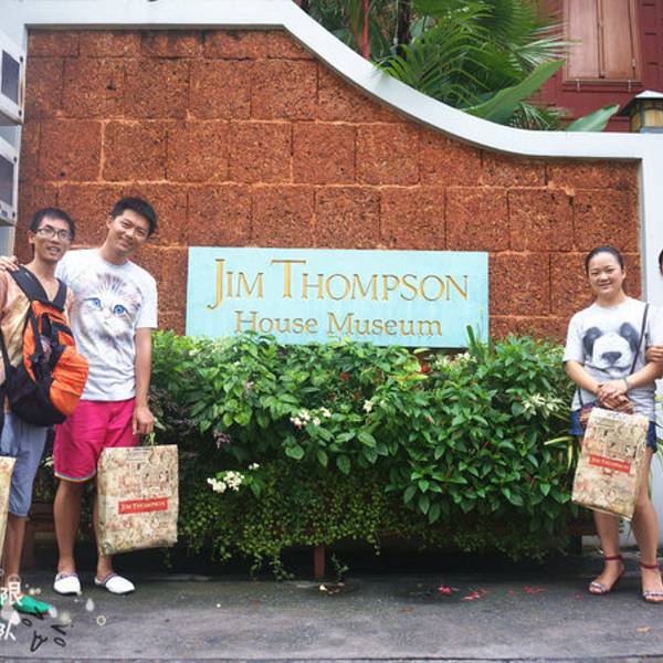 吉姆.汤普森原来是一名美国建筑师,二战后成功的把泰国丝绸推销到西方市场,振兴了泰国的丝绸业。他本人于1967年在马来西亚失踪。整个建筑是座典型的泰式花园,建于1959年,由7座建筑组成,并悬空在一条小运河上。这里是泰国最出名的泰丝专卖店,也是一个泰丝博物馆,收藏和展览各种高档泰丝。并辟了一个门市部销售高档泰丝。除此之外,这里还展出了吉姆.汤普森收藏的各种艺术品,如家居装饰品、瓷器等,展品不仅包括泰国,甚至涵盖了整个亚洲。