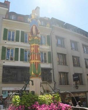 在洛桑的老城区,距离圣母百花大教堂不远,广场很小,中心位置有一个带雕塑的喷泉,广场最有名的是喷泉后面的天文钟,整点会有报时演出