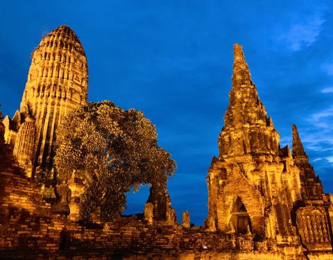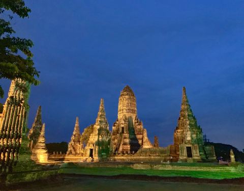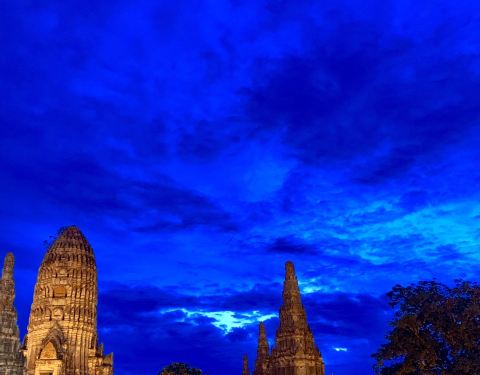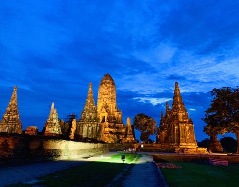 柴瓦塔那兰寺又称贵妃寺,坐落在大城历史公园昭拍耶河西畔,大城岛外,是大城府很雄伟美丽的寺庙之一。 塔群的中央是一座高棉式的大塔,四周有4个小塔,外面则有8个更小的塔及门。13座高塔的周围围绕着120尊坐佛,8个小塔中端坐着12尊大佛,保存完整,庄严郑重。 柴瓦塔那兰寺位于昭拍耶河河畔,日落时分,暖阳洒在河面上,映照着寺庙的塔群,形成了不俗的剪影,烘托出寺庙厚重的历史感与辉煌的过去。