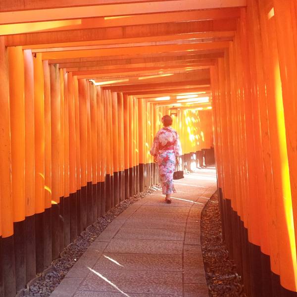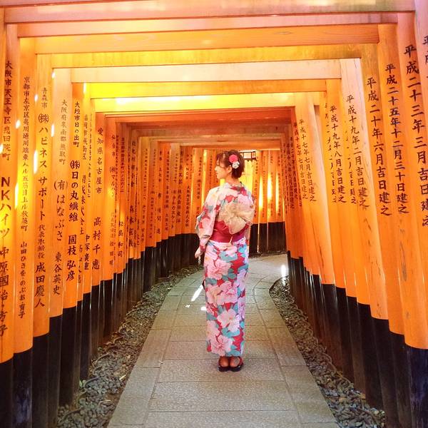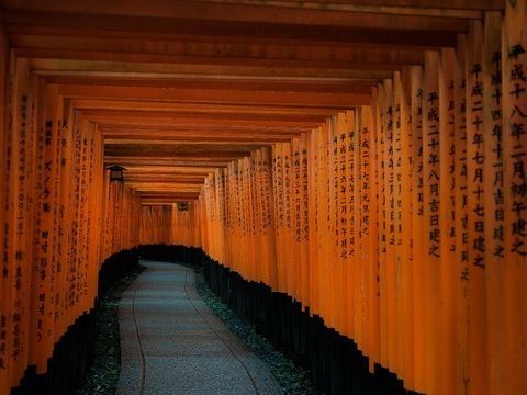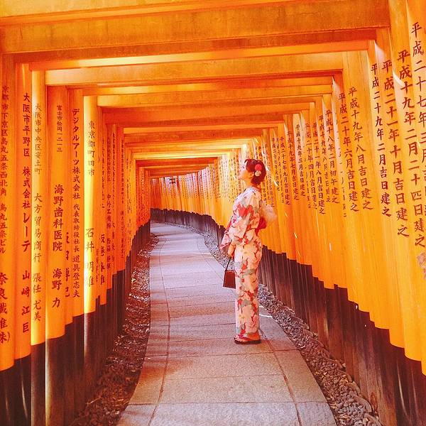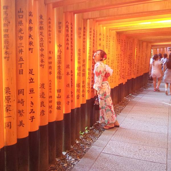 鸟居是日本神社建筑物,主要用以区分神域与人类居住的世俗界,代表神域的入口。千本鸟居位于伏见稻荷大社,从山脚到山顶,密密麻麻而又有秩序排列着万座鸟居。每一个鸟居的背面都刻建造年份和商社、公司的名称。 拍摄地之一 走进千本鸟居,老朽褪色的暗红色牌坊和光鲜亮丽的朱红色牌坊密集地交织在一起,视觉上令人震撼。电影《艺伎回忆录》曾在此取景拍摄,小千代跑过的橘红色隧道就是千本鸟居。在半山的路口还可以俯瞰景区的美景,全程约4公里。 体验日本文化 伏见稻荷大社几乎每个月都有各种“行事活动”或者“祭”,是体验日本文化的非常好的方式。这里的稻荷神社的稻荷大神主要负责商业兴旺。