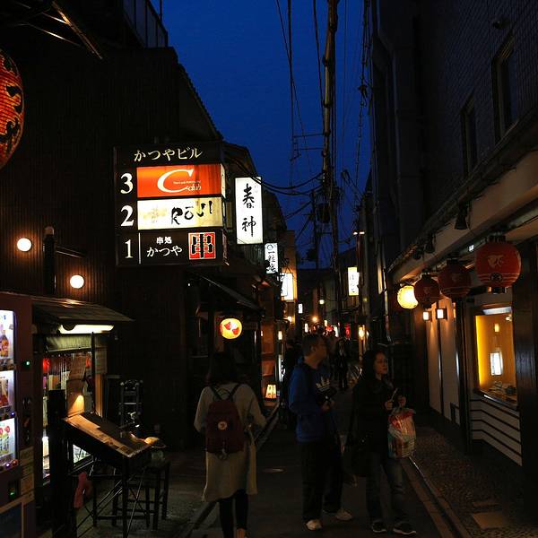 从八坂神社出来后,便来到了河原町和鸭川区域。一天都徜徉在古老的日式建筑间,突然看到现代的街道,还真有种穿越之感。顺着河原町一直走,不知不觉就来到了大名鼎鼎的鸭川。之前看过鸭川樱花季的照片,那叫一个美。但是看到夜幕下黑漆漆的它,真是跟想象中差了十万八千里……所以,想欣赏鸭川的小伙伴,一定不要晚上来哦~河边高档料理店的落地窗,亮着暖黄色的光,依稀还能看到正在用餐的人影。大众点评查了下,大都是人均两三千的怀石料理。那些小窗里的,都是怎样的人,有着怎样的故事呢?顿时觉得一条河、一面窗,一盏灯,都有了别样的神韵……