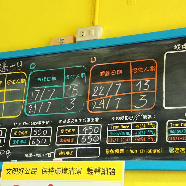 顺利找到汉清迈,前台MM挺甜美,可是说话速度能不能快一点,包括和她在交谈一日游计划的那两个MM...顺利找到汉清迈,前台MM挺甜美,可是说话速度能不能快一点,包括和她在交谈一日游计划的那两个MM,一边说着我们很赶,要帮看看怎么安排行程好,一边语速又乱慢。在这里可以定去PAI的MINI BUS车票,当天也可以,可...顺利找到汉清迈,前台MM挺甜美,可是说话速度能不能快一点,包括和她在交谈一日游计划的那两个MM,一边说着我们很赶,要帮看看怎么安排行程好,一边语速又乱慢。在这里可以定去PAI的MINI BUS车票,当天也可以,可是我们那会儿,她又打不通BUS的电话了,墨迹了半天后,果断问她还有什么方式可以去PAI,告知双条车去车站,于是让她标了地图上位置,写了蝌蚪文,拿着纸条就出发了,到了车站发现,班次很多啊,价钱一样,都是150B单程,买了最近那班车,继续囧囧的出发。 展开