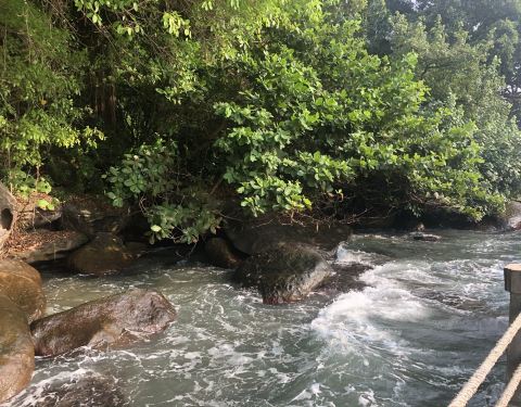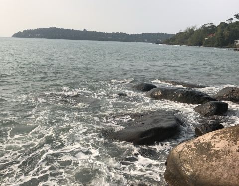 酒店的沙滩,可以看日落,酒店客人可以用躺椅,礁石上有螃蟹,森林有猴子。