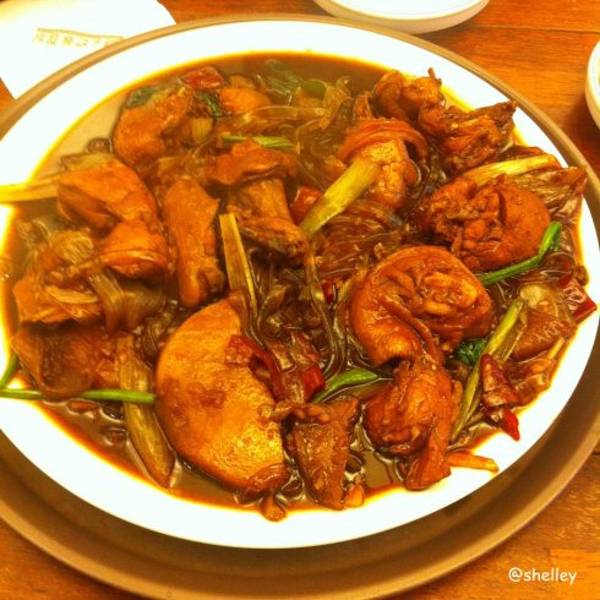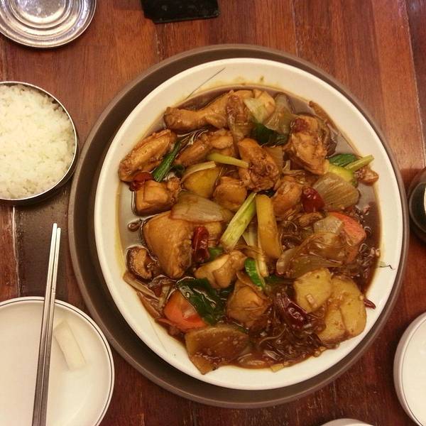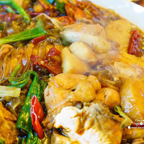 我们点了2人份的海鲜炖鸡!超级推荐啊!!!有螃蟹、八爪鱼、蛤蜊、青口、土豆、胡萝卜、粉条、鸡一起炖煮的,入口很咸甜,鸡超级嫩的!2w9韩币两人份,四个人吃正好,来明洞一定不要错过的店!看到我们邻桌点的纯安东酱鸡,没有海鲜,他们吃了几块就不想吃了,所以个人建议要点有海鲜的哦,纯鸡的话吃到后面都腻掉了,嘿嘿。