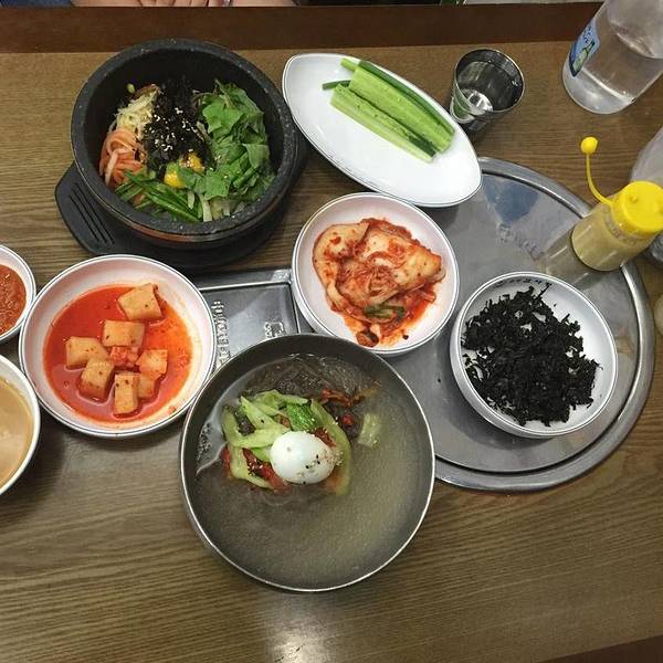 一盘子炖鸡肉块,大部分都没有骨头,外加胡萝卜、土豆,吃起来味道咸淡适中,有点微辣,很符合我们的口味。配合上一碗米饭,吃起来很带劲的。两人份套餐加两碗米饭:21000WON(126RMB)