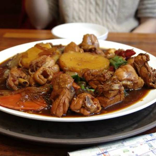 一盘子炖鸡肉块,大部分都没有骨头,外加胡萝卜、土豆,吃起来味道咸淡适中,有点微辣,很符合我们的口味