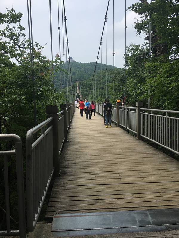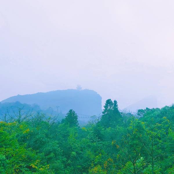 山顶上建有一座仿明清风格的瞭望塔,站在此处,居高临下,视野开阔。遇到天气晴朗时,能将武陵源风光尽收眼底。遇到云雾弥漫时,又如身处仙境,飘飘欲仙。可惜我们遇到的云雾太大了,什么都看不清楚,所谓过犹不及,可能就是这样吧。远处隐约可见的瞭望塔和悬索桥 展开