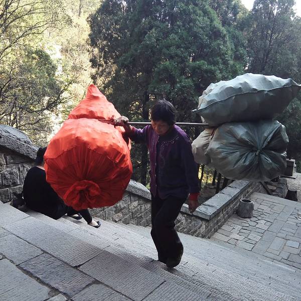 回马岭这里也是泰山人很多的地方了啊,今天特地来到这里感觉这里的雾气还是很大的地上有点湿滑爬山的时候还是需要注意安全的呢。
