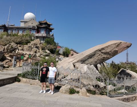 金骆驼 拱北石位于观日出最佳地点日观峰上,那边有气象台宾馆、旭日宾馆、迎旭宾馆,在这里住宿并观日出也是...拱北石,因其形犹如起身探海,故又名“探海石”。位于泰山玉皇顶东侧的日观峰上,是登岱观日出的好地方,也是泰山标志性景点之一。泰山顶上观日出,实乃高瞻远瞩。泰山日出为泰山四大奇观之一。登泰山而不看日出...拱北石,因其形犹如起身探海,故又名“探海石”。位于泰山玉皇顶东侧的日观峰上,是登岱观日出的好地方,也是泰山标志性景点之一。泰山顶上观日出,实乃高瞻远瞩。泰山日出为泰山四大奇观之一。登泰山而不看日出的话,绝对是一大遗憾。泰山看日出,临行前夕一定要看一下泰安当地的天气预报,否则受累后不一定有回报!泰山观日出的最佳位置主要在日观峰的拱北石和瞻鲁台一带,以及玉皇顶一带。由于泰山基础设施完善,近年来夜爬泰山观日出非常盛行,夜里登山路上5-9月份经常摩肩擦踵。拱北石一带是观日出最佳位置之一,也是拍照最好的背景之一,所以凌晨在这里看日出的人很多!有时甚至非常拥挤,特别是周末以及节假日的时候!泰山日出的具体时间,可根据不同季节百度一下,泰山景区很多地方也会有提示。我喜欢在五月岱顶海棠花开得季节来赏花观日出,这个时段一般早上5点前后就日出了!为了不错过时机,通常日出前要预留半个小时提前到达观日地点。个人体力不同,也爬泰山一般需要4-6小时,并以此安排上山的时间,体力好的一般夜里12点开始从红门上山比较合适,既不影响日出,也不会太早到在山顶受冻!东方的天空上方出现了鱼肚白并并慢慢泛红,观日出的人们开始躁动。5:01分,金灿灿的太阳跃出了云层,天空顿时霞光万道,五彩缤纷!山顶的空气沸腾了,人群中传来了一片欢呼声,相机的快门声更是一波接着一波!日出大约持续10分钟左右,随后太阳开始刺眼,人们也开始陆续离开。此时的大地显得生机勃勃,和风煦煦。熬了一夜的人们脸上洋溢着满足的喜悦,到处欢声笑语,拍影留念。如果观日出人太多的话,从拱北石和瞻鲁台右侧过去还有几个山头都可以看,而且人少,可以尝试一下独自或两人赏日出的独特感觉。拱北石作为岱顶重要的景点之一,一直是游客争相拍照留念的地方。尤其是日出时段,在拱北石赏日出的角度确实不错,而且登上拱北石留影也是感觉很酷的样子!所以,经常有游客上违反规定,越过拱北石旁的护栏,爬上拱北石!