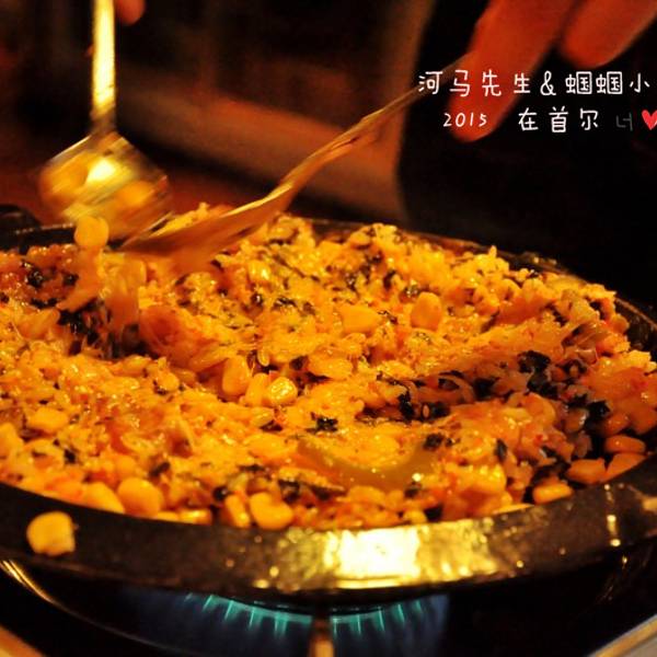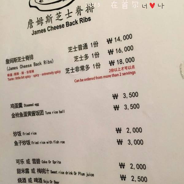 然后就下山了,坐5路旅游车直接到明洞地铁3号出口,从地下通道穿过马路,就到明洞主街了,然后直奔主题,找当下最火的芝士排骨,吃吃吃起来。芝士排骨其实就是在一个大锅上铺上满满的一层碎芝士,把提起红烧好的肋排放在上面,然后加热,等芝士融化后,用芝士把排骨包裹起来吃,芝士浓郁的香气混搭肋排经典的口感,很独特创新的吃法,赞爆了~服务员用大剪刀帮我们把排骨剪成一条一条的融化后的芝士第一块,是服务员帮我们卷好的想自己尝试一下,瞧这两人手忙脚乱的大概是爬山累了,两份排骨被我们三下两下就吃完了,然后剩下的芝士可以点炒饭,拿芝士拌着炒,给我们炒饭的服务员是个中国小伙儿,好亲切呀,关键是,颜值还高,有没有点像彭于晏呢小伙儿还很贴心的给我们做了个心形的鸡蛋 炒饭有普通和鱼籽之分,味道是没有区别的,只是鱼籽里有鱼籽的口感,我们点了鱼籽的,挺好吃的免费的小菜,韩国每家餐馆都会有这种免费的配菜菜单,有中文的店内环境,现代工业的装修风格我们去的就是这家店啦,詹姆斯芝士排骨明洞店,微博上网站里大多都推荐的这家,正好在我们要去的明洞有店,所以就它了。不过味道确实也挺正的,值得一试,价格也不算贵