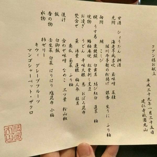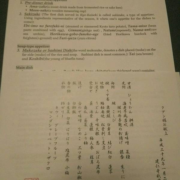 怀石料理名称出于《老子》:“是故圣人被褐怀玉”,体现人、自然、食材的和谐统一。我们去吃的怀石料理共有十一道菜,吃了两个小时。