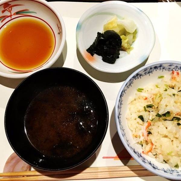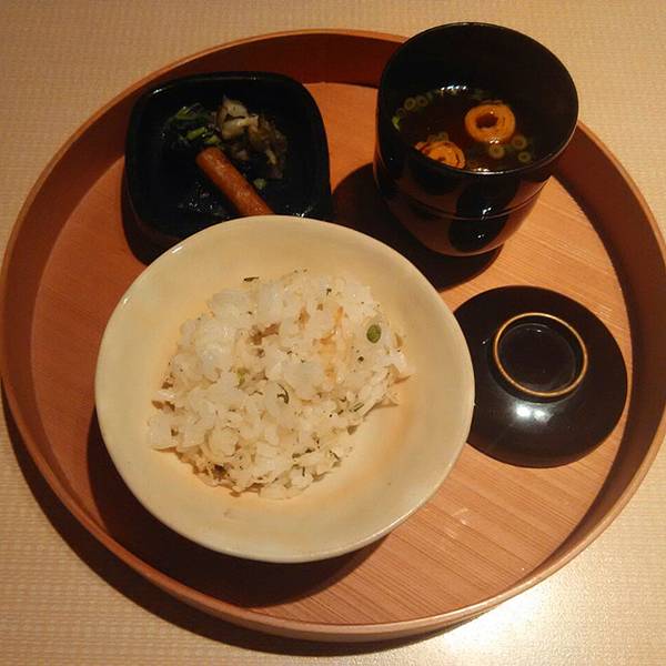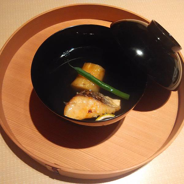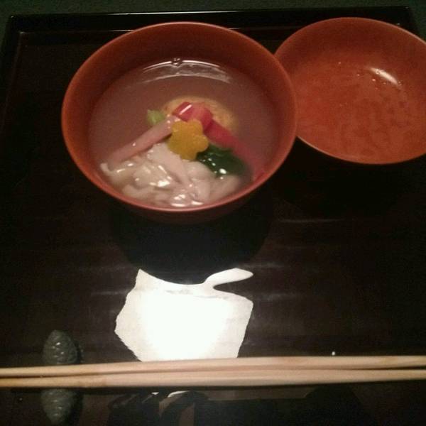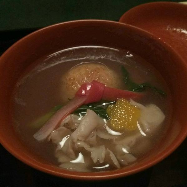 味增汤里有三叶和小菇,京都的味增汤压巴里最正宗。我们去吃的怀石料理共有十一道菜,吃了两个小时