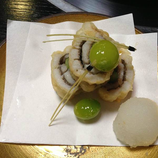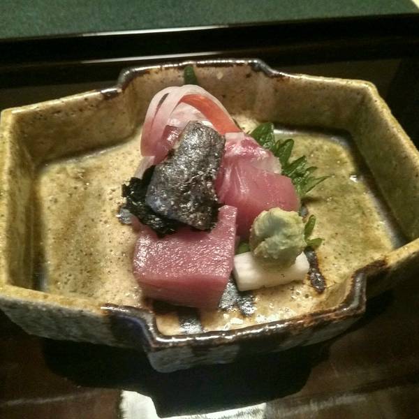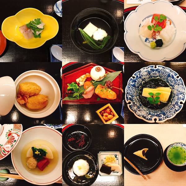 说到日本的美食,可能大家能立刻想到的就是寿司和刺身。但真正能够代表日本料理最高级别的(民间能够品尝到的),是怀石料理。Mandy第一次去日本,在东京也吃过一次怀石料理,这次来到中部,也不想错过体验他们对待食材的用心与用工。这家店在名古屋,叫“志ら玉”。我们来这里体验日本茶道,顺便晚饭在这里体验怀石料理。日本的茶道里保持了更多的“礼”和“尊敬”,体现在他们对器皿的讲究、姿势的到位、对茶道精神的恭敬。下面这张照片是这个茶室最大的一个房间了,可以容下十几个人同时品茶。日本的茶道,和中国的茶叶不同,主要是抹茶。装着茶的器皿,一不小心就是几百年前的老古董,把玩器皿上的用漆、花纹,也是品茶的内容之一。接下来就是耗资12000日元、耗时2小时、十几道菜、又长又精致的怀石料理。怀石料理非常讲究食材的新鲜,通常像笋、叶菜这类的晚上用的食材,到当天中午才会采摘下来,保存最新鲜最原始的味道。品尝大自然赐予的味道,而不像西方的一些菜系的食物,都靠酱料来带味。丸子汤通常能够体现厨师对清汤的理解和把握,丸子的口感对技巧也要求很高。煎鱼非常好吃,鱼肉质很嫩,而外面煎得酥脆皮香。下面这两道主食是我至今还在回味的。左边的是海苔配生的山药泥饭,山药泥润物细无声,流质地包裹着饭粒,而饭粒筋道又分明。这碗面更是让人回味无穷,汤非常清香,面又软又浓麦的味道。番茄酸甜适中,很适合清洁味蕾+中和油腻,而最后这个甜品则给整个怀石料理画下了完美的句号。其实,到第五道的时候我就有点跟不上大家的节奏了,都上下一道了我的前一道还没吃完。但每一道都那么好吃,都舍不得浪费。