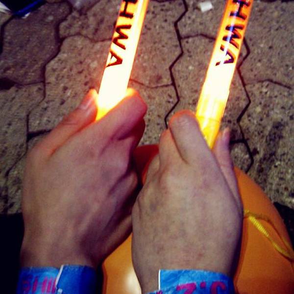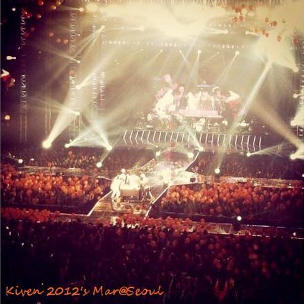 怀着忐忑的心情向演唱会现场奥利匹克体育馆出发。乘了好久的L5,一下站跟着一群人沿着一片橙色走,终于亲身感受了韩国的演唱会文化。很多妹妹去韩国都是为了看演唱会,在此提两句演唱会的的小贴士。在演唱会票子搞定的情况下,也请提前2小时到场,全是女孩子的地方你们懂的,排个厕所都能排死你。韩国的演唱会文化已经很规范,分工很明确,一点都不会乱。Standing先到旁边规定的小亭子换相应区域的手环,然后排队寄包,有些演唱会管的很紧,完全不能带任何东西进场,有些可以带包,但是演出当中拿出相机等设备都会被做偷拍处理被请出去的,难得去看场演唱会也是为了Hi一下,背着个包也麻烦,还是全寄掉吧,1000韩元一包,有专人看管,挺安全的。拿着手环和票子去相对应的Standing区域排队,根据票子上的号码,基本100-200号排一排,200-300以此类推,进场后就自由发挥吧。