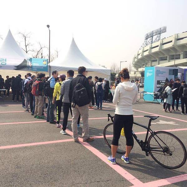 坐地铁去奥林匹克运动场领取跑步装备。在蚕室的奥林匹克运动场领取参赛的包裹。大家井然有序的排队坐地铁去奥林匹克运动场领取跑步装备