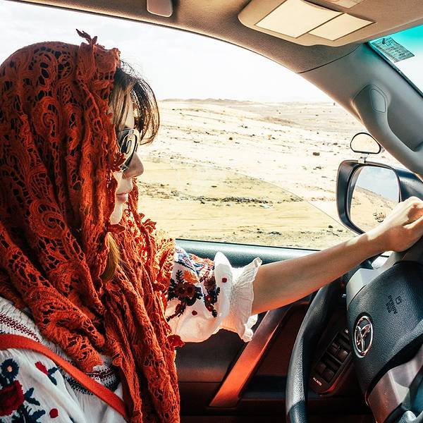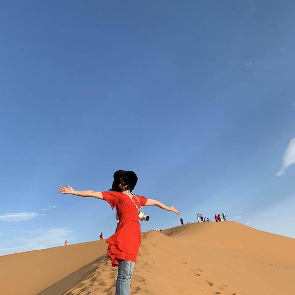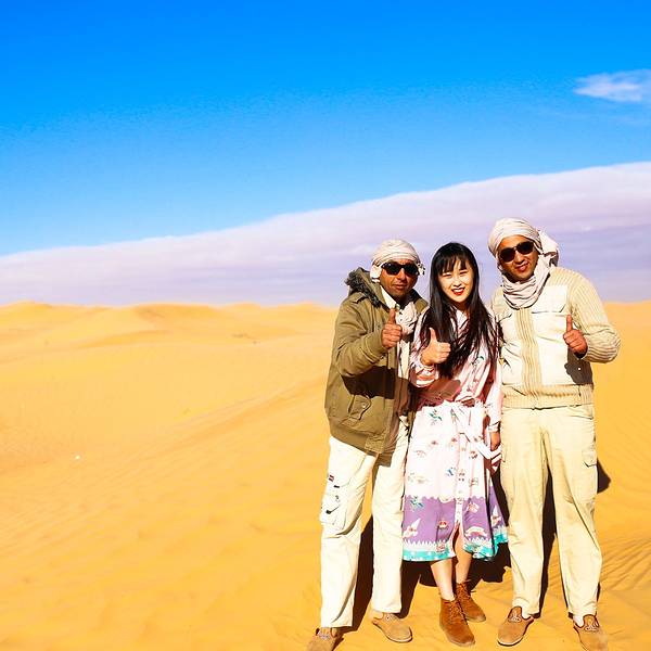 乘坐越野车到达沙漠酒店。由于越野车空间有限,一车4人,今晚的行李箱不跟人走了,随身携带了入住酒店所必须的用品和衣物,到酒店的第一件迫不及待的事就是换装,然后骑骆驼进沙漠看日落。再余下的时间就是在柔软的沙丘上肆意的摆拍,累了就坐下来欣赏美丽的日落,此时只有美人美食美景! 展开