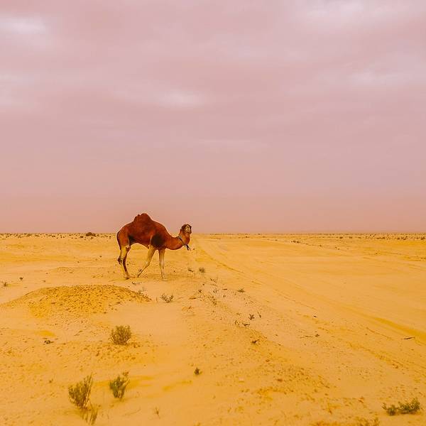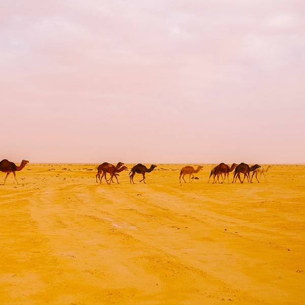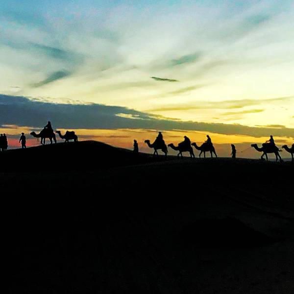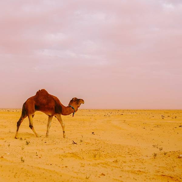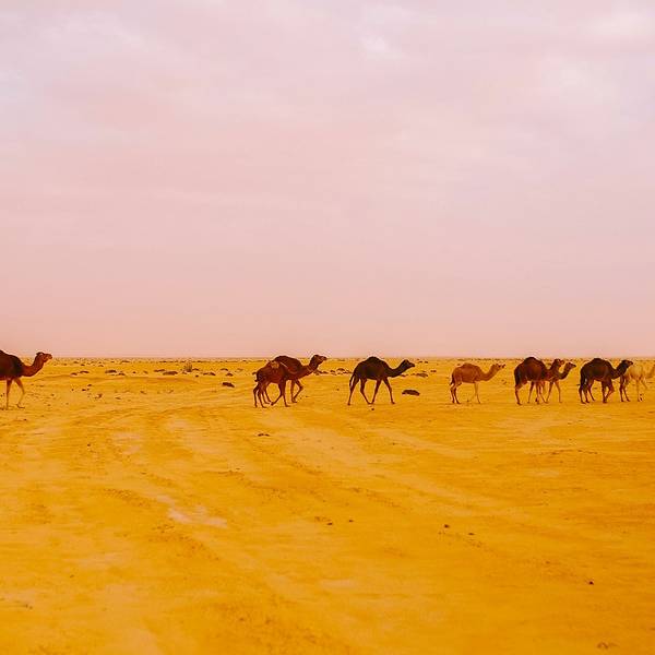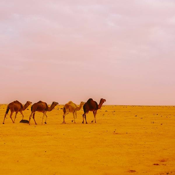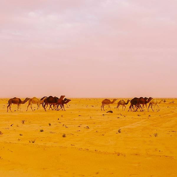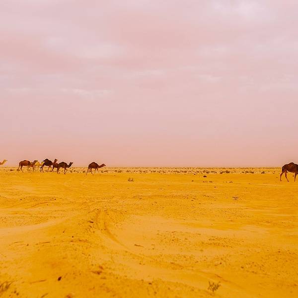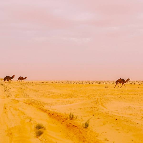 沙漠还是纹丝不动,与我幻想的漫天黄沙举步维艰的场景大相径庭。骆驼并没有想象中难骑,行径在沙丘之间,景色并不开阔。“待会儿我们一定要爬上那个最高的沙丘去看日落”!然而,抵达营地时...- 走在沙漠的公路上。