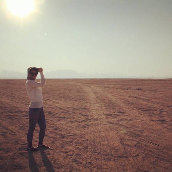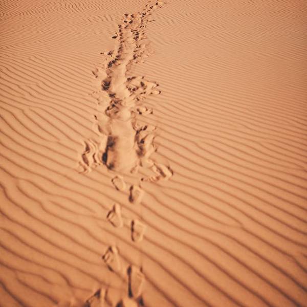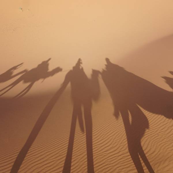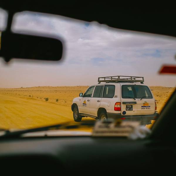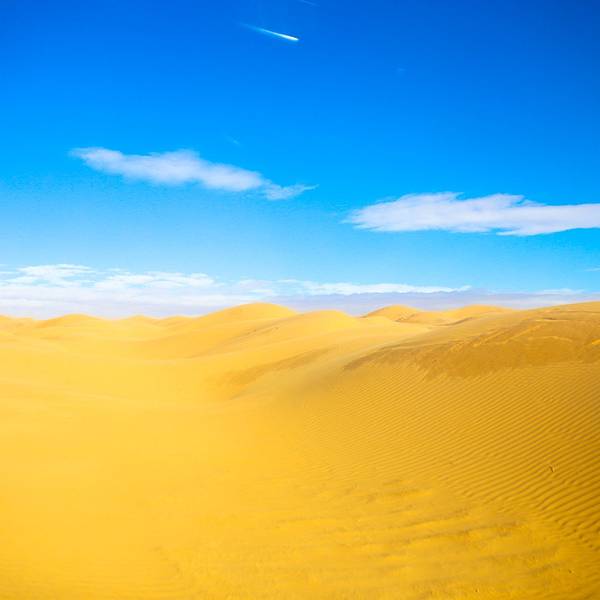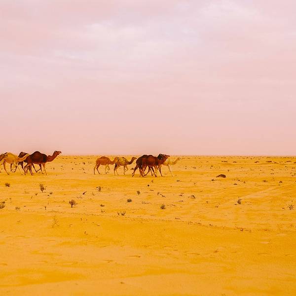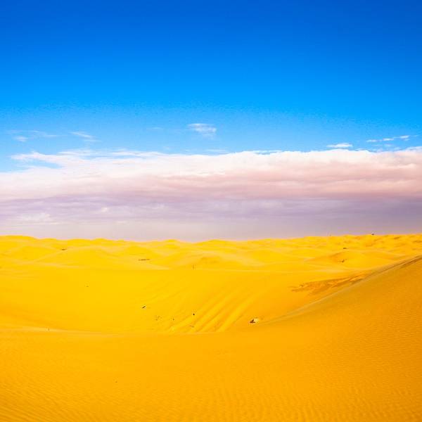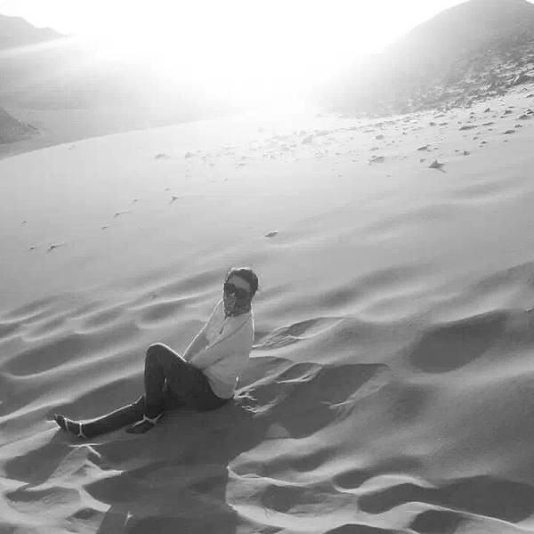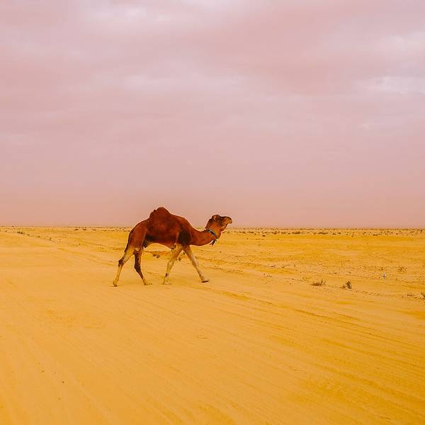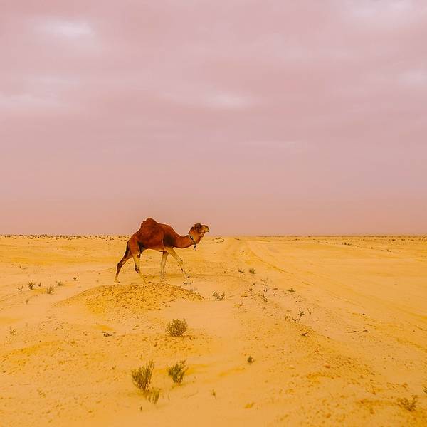 沙漠还是纹丝不动,与我幻想的漫天黄沙举步维艰的场景大相径庭。骆驼并没有想象中难骑,行径在沙丘之间,景色并不开阔。“待会儿我们一定要爬上那个最高的沙丘去看日落”!然而,抵达营地时...- 走在沙漠的公路上。