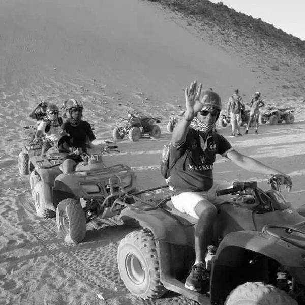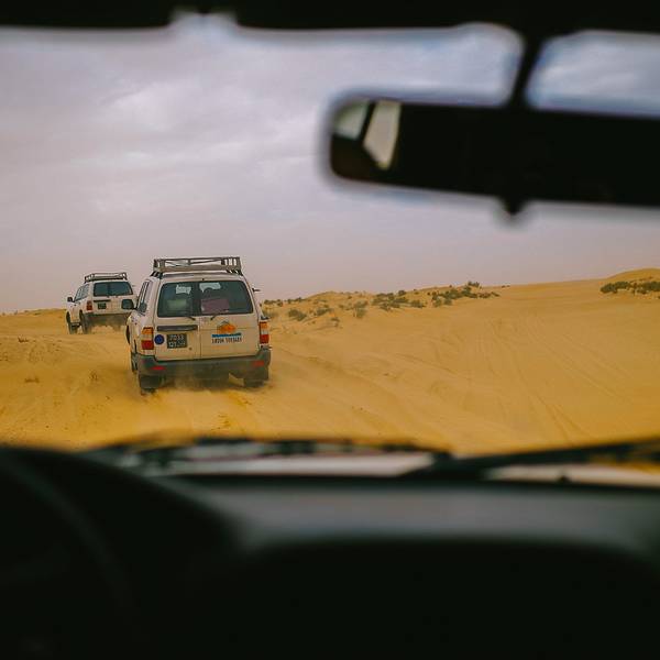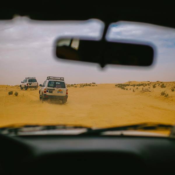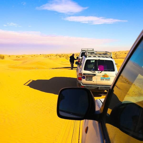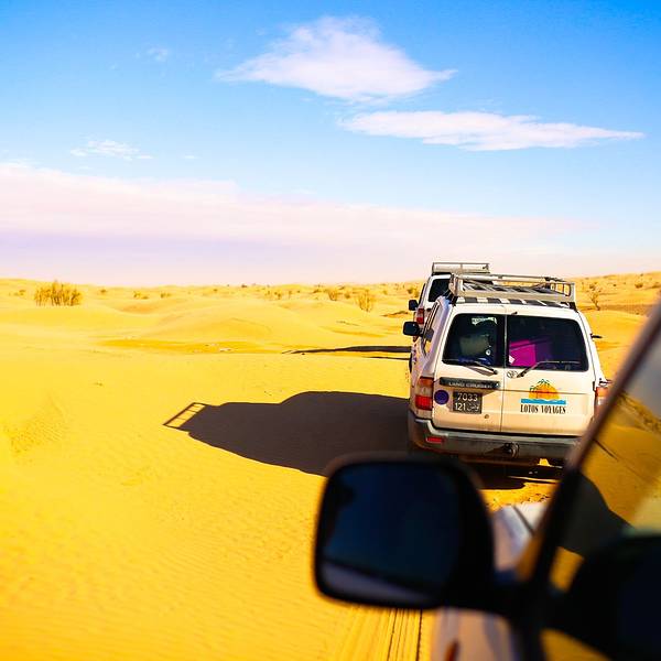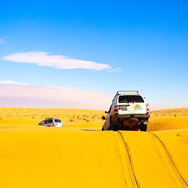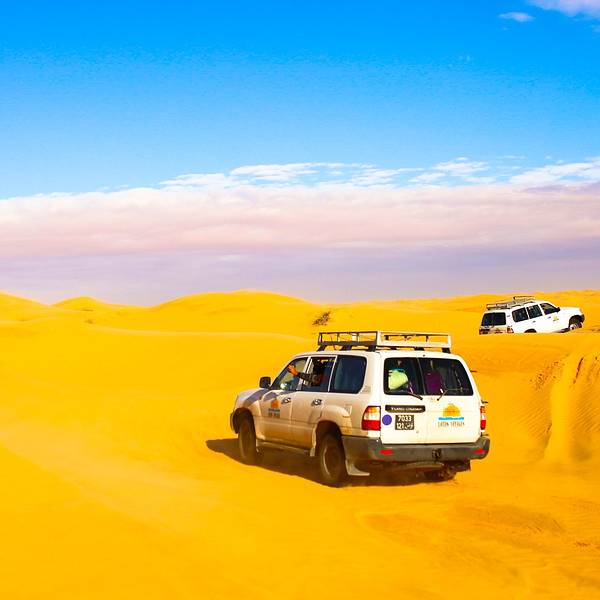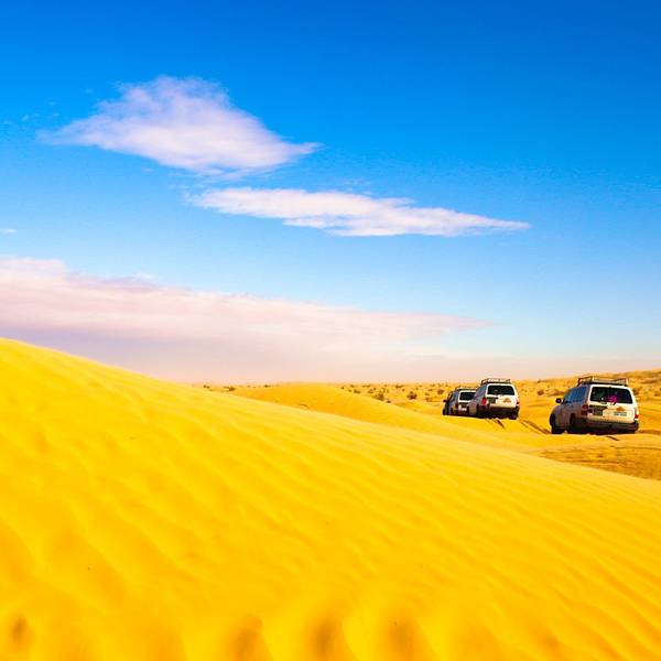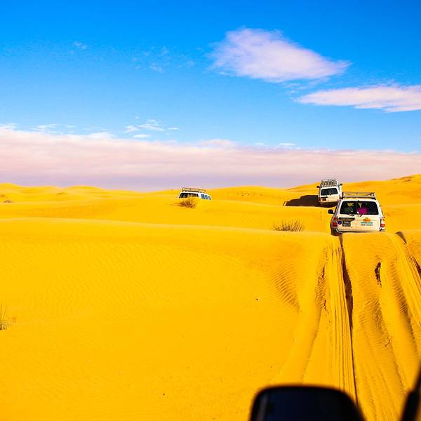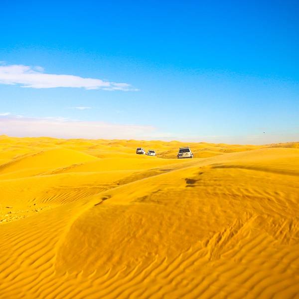 从杜兹进撒哈拉的路上,大家都太累了,个个昏睡过去!不知道开了多久,突然我们越野车开始剧烈颠簸起来~整个人坐在车里被晃到瞬间清醒,一睁眼,我们就被眼前的景象给惊住了!我们的越野车开始不断的在大大小小,越来越陡、越来越高的沙丘上翻越~顾不上困不困什么的,赶紧拿起相机拍下这一幕!我们的司机都是杜兹最有经验的司机,没有GPS没有任何的别的工具,他们完全凭借着经验开进沙漠,一车紧跟一车,沿着头车的车辙印前进~翻越其中连着巨陡的近10个坡的时候,我们被颠的不行,甚至屁股都不能坐稳座椅,整个人左右摇晃,但我们司机大哥还特别淡定的听着阿拉伯音乐,悠悠的换挡、擦刹车、踩油门!不知道就这样翻越了多少个沙丘,待我再坐稳的时候,眼前就是这样的景象了!我竟被眼前的景象美的说不出话来,许久,自由自语道:是啊,这就是撒哈拉了呀!