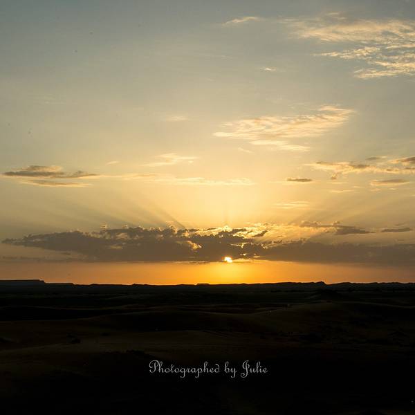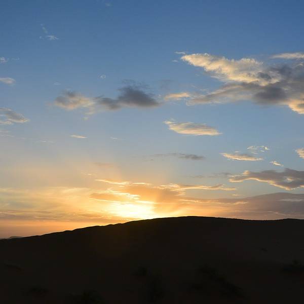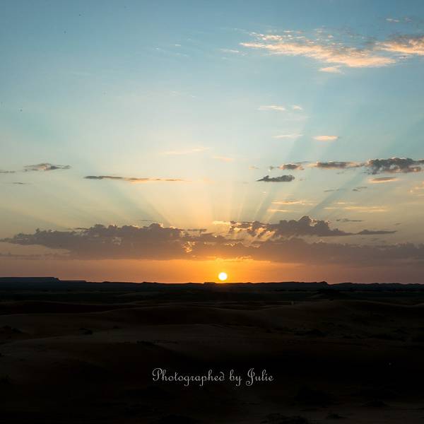 ...平线已露微光,随着时间的推移,它慢慢从温暖、柔软的光晕,一点一点变为瑰丽的光芒,直射向四面八方我虽然没有三毛情结,但在撒哈拉看日出依然是一件极具意义的事。在这儿看日出不用起得很早,具体时间还真忘了,反正一问营地的员工都知道。不过为了拍照,还是得早点起床换上准备好的行头。