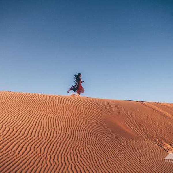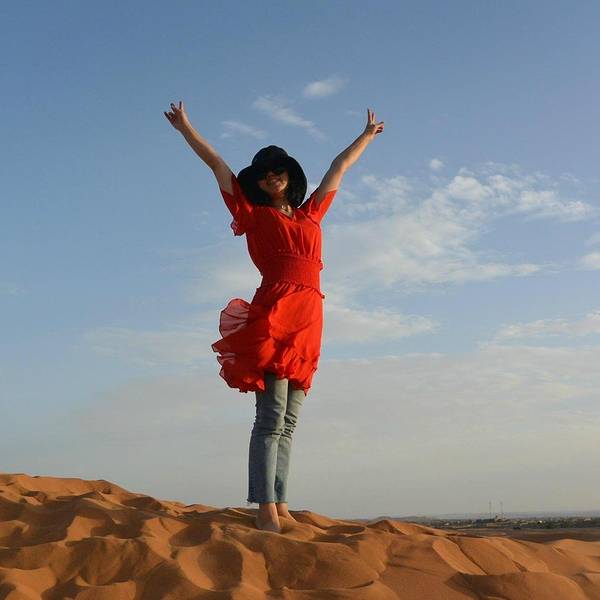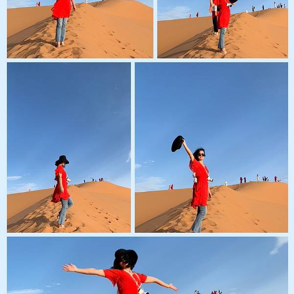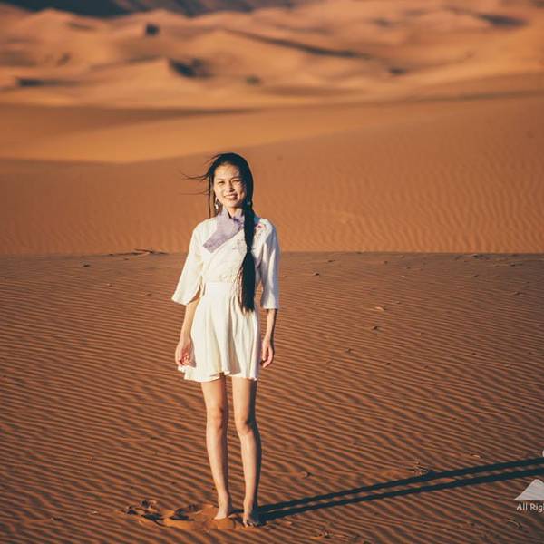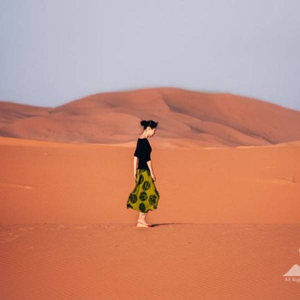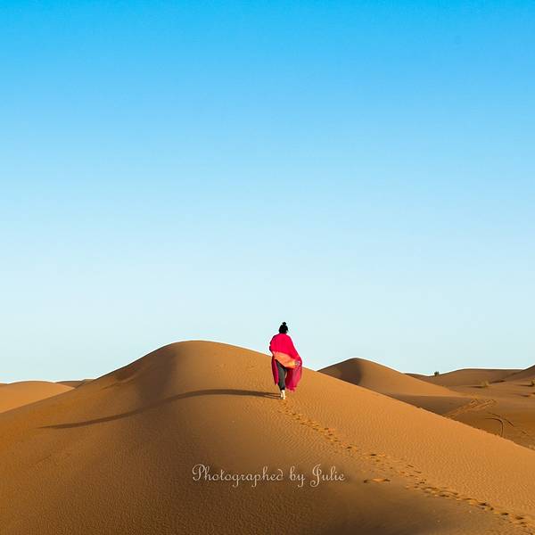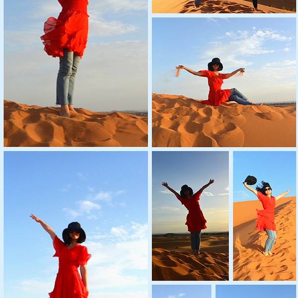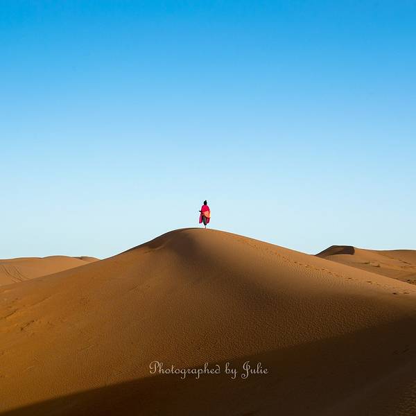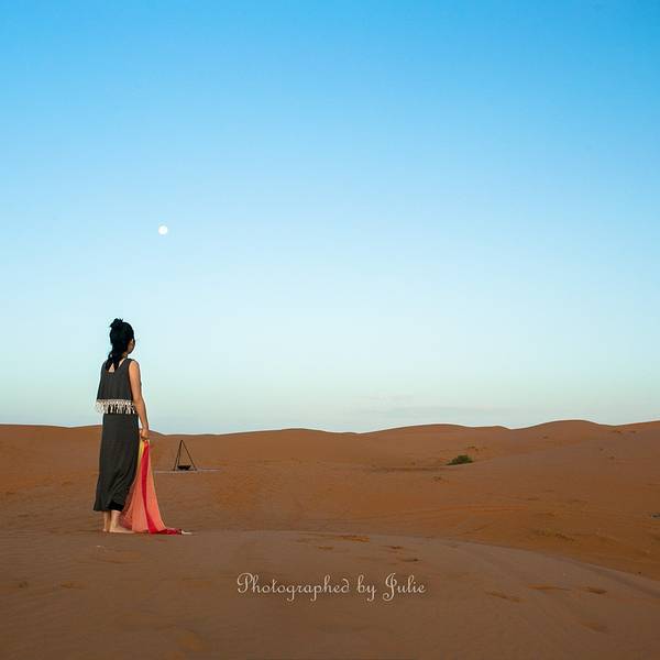 所以那天的情景应该是这样的:在遥远的非洲撒哈拉沙漠 中,太阳还未升起,此刻出现了一名蓬头垢面、戴着500度近视眼镜的 中国 籍女子,身着飘逸的拖地长裙,左手扛着三脚架,右手举着单反相机,正艰难地在一座十多米高的沙丘上攀登,吭哧吭哧,“自己摔下去不要紧,相机不能毁!”,她这么想着,然后依靠这样的信念终于爬了上去。