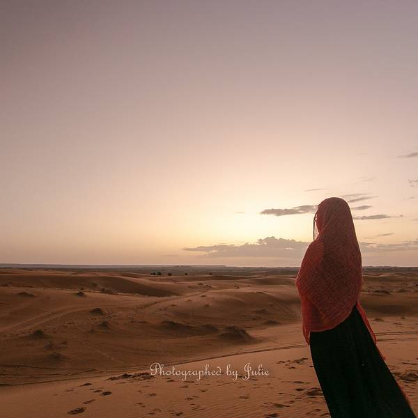 所以那天的情景应该是...我虽然没有三毛情结,但在撒哈拉看日出依然是一件极具意义的事。在这儿看日出不用起得很早,具体时间还真忘了,反正一问营地的员工都知道。不过为了拍照,还是得早点起床换上准备好的行头。