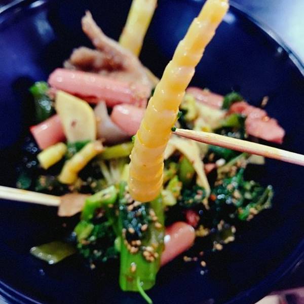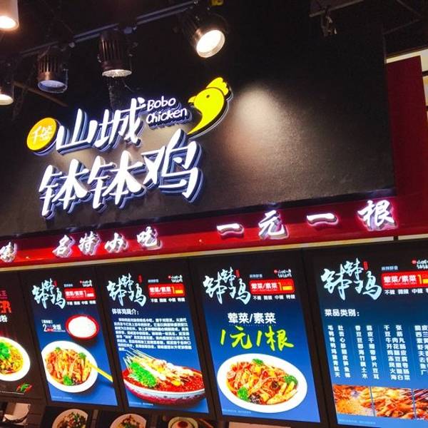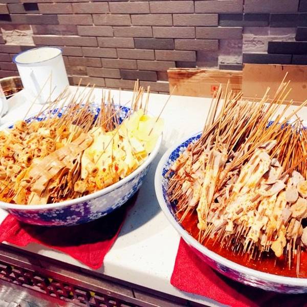 另一家值得推荐的就是“山城钵钵鸡”。钵钵鸡是四川的传统名小吃,起源于乐山,属于川菜系。是以陶器钵盛放配以麻辣为主的佐料,加上多种调料的去骨鸡片拌和而成。有皮脆肉嫩,麻辣鲜香,甜咸适中的特色。可我们都信以为真的认为钵钵鸡一定就是鸡肉吧,然而并不是。钵钵鸡的另一大特点就是食材种类丰富,所有荤菜素菜都可以放进去。挑选好自己爱吃的串串钵钵鸡,服务生就会开始用剪刀剪碎,加之香油、辣酱、葱花、香菜、芝麻等各种佐料,搅拌均匀,一大碗油光发亮的美食就呈现在眼前,真是惊艳到我了。再不赶紧吃,口水就流出来啦!