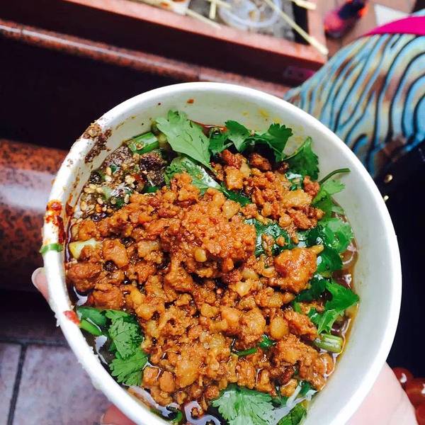 在重庆随处可见的火锅店儿就不用说了,但你在八一路好吃街,还能够找到那家排起来的队伍永远望不到尽头的〖好又来酸辣粉〗。至今还记得第一次鼓起勇气排了老长的队伍买到6块钱一碗儿的杂酱酸辣粉的时候,跟朋友一起坐在在地下小吃城里好不容易找到的座位,伴着嘈杂的环境和美食窗口大叔们的叫号声,边哭边吃(生平第一次真正意义上被辣到流泪)。可就算是被它辣得鼻涕眼泪逆流成河,那一碗满满的肉沫和好又来独家调出来的酱汁混合散发出的香味儿,配上葱花儿香菜碎花生,让人根本不忍心停下嘴来。