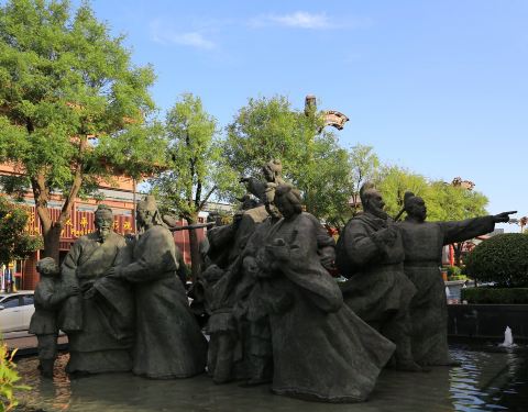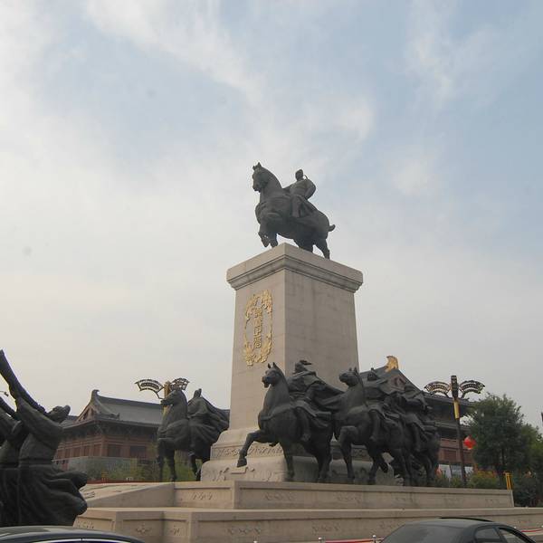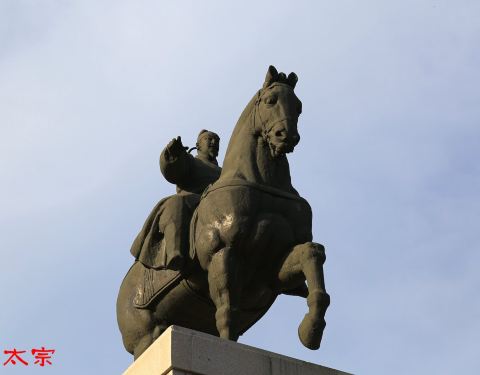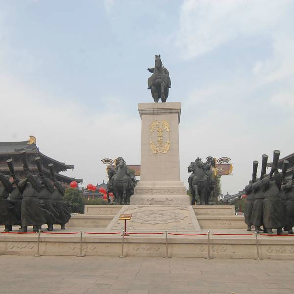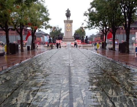 贞观文化广场位于大雁塔南边的大唐不夜城中段,广场中心矗立有一组雕像,李世民的雕塑在高高的立柱上,他胯下骑着一匹战马雄伟高大,气宇轩昂。是大唐不夜城的标志性雕塑,值得一看。