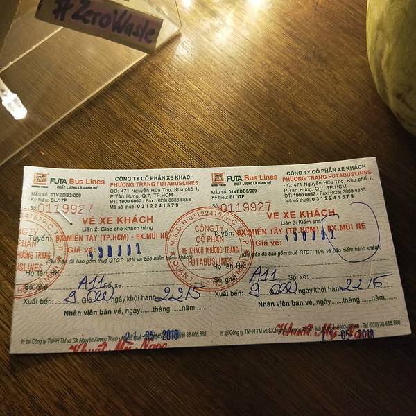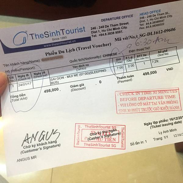 我是通过淘宝的一个店家订的,他不收手续费,买好之后传给我了一张凭证,我拿着凭证和护照到柜台换主票,拿好主票,在出发前半小时再来换车票和行李牌。之后的一程美奈到大叻也是在这里一起换主票的,车票和行李牌在美奈的新咖啡换取。