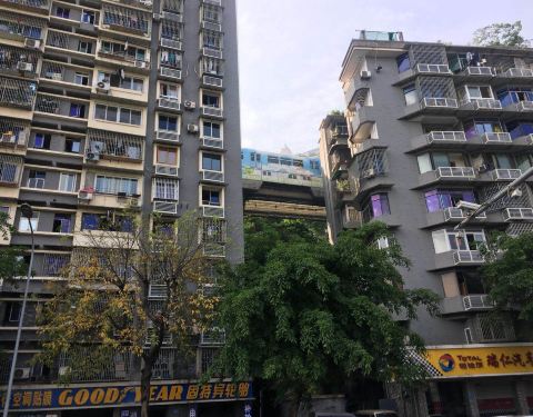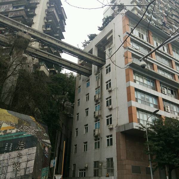 重庆轻轨,站台在楼上八楼,穿过一整栋楼