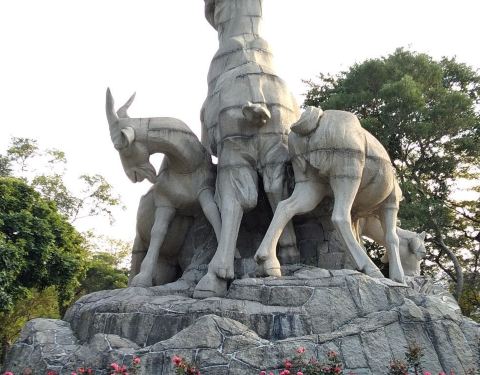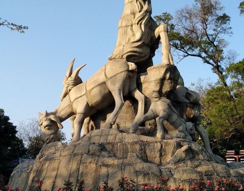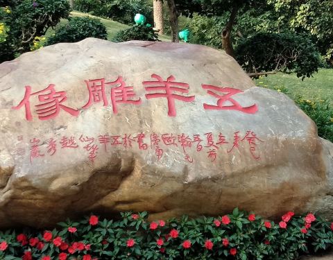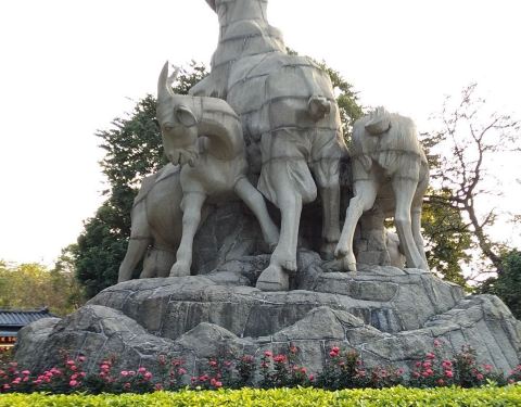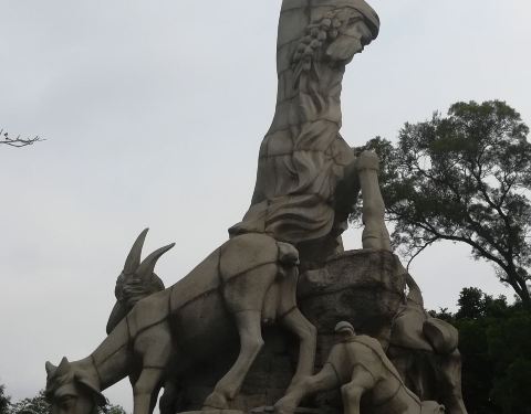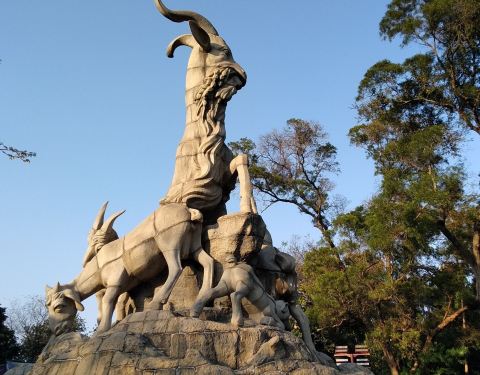 广州越秀公园矗立的五羊石像连基座高11米。五羊大小不一,姿态各异,造型优美,已经成为广州城市的标志广州越秀公园矗立的五羊石像连基座高11米。主羊头部高高昂起,口中衔穗,回眸微笑,其余四羊环绕于主羊周围,或戏耍,或吃草。五羊大小不一,姿态各异,造型优美,已经成为广州城市的标志。