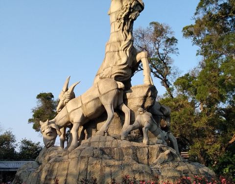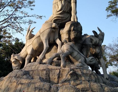 建于1959年,位于越秀公园西侧木壳岗上,由130多块花岗岩雕刻组砌而成‘高11米,体积53立方米“五羊石像”是广州最著名的标志之一。建于1959年,位于越秀公园西侧木壳岗上,由130多块花岗岩雕刻组砌而成‘高11米,体积53立方米。石像中大山羊居中,昂首远眺,羊髯微拂,口衔“一茎六出”谷穗,雄浑有力的羊...“五羊石像”是广州最著名的标志之一。建于1959年,位于越秀公园西侧木壳岗上,由130多块花岗岩雕刻组砌而成‘高11米,体积53立方米。石像中大山羊居中,昂首远眺,羊髯微拂,口衔“一茎六出”谷穗,雄浑有力的羊角伸向半空,显得深沉、威武。余下四羊环列四周,或小羊跪乳,或母羊回首,或吃草,或嬉戏,形态可爱,栩栩如生。 展开