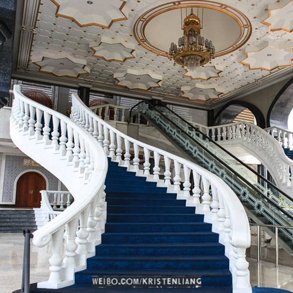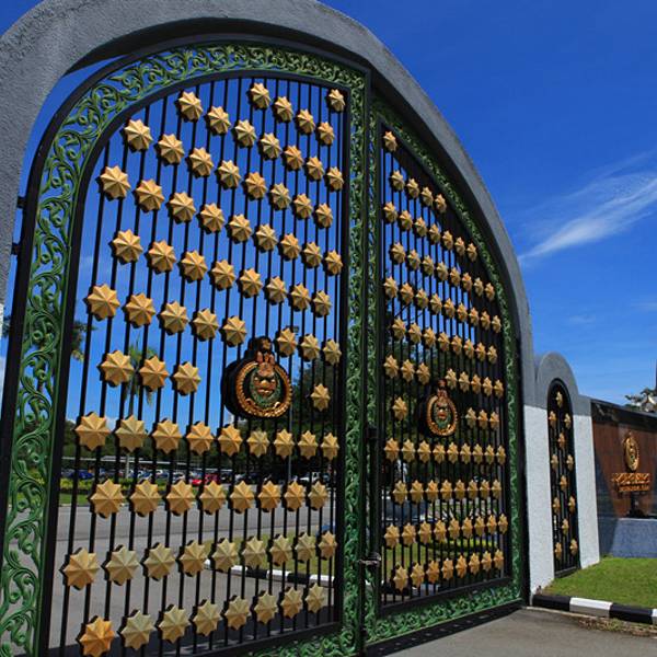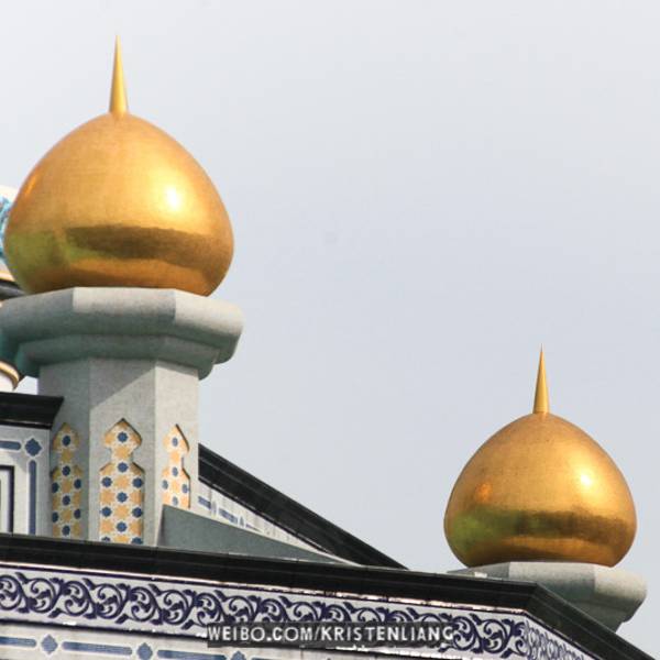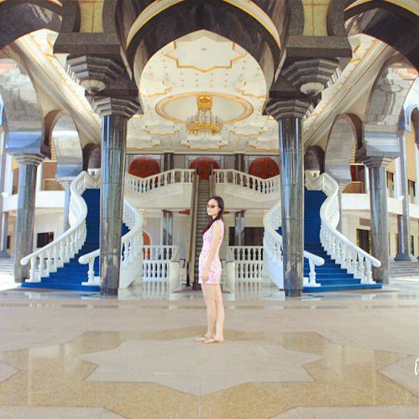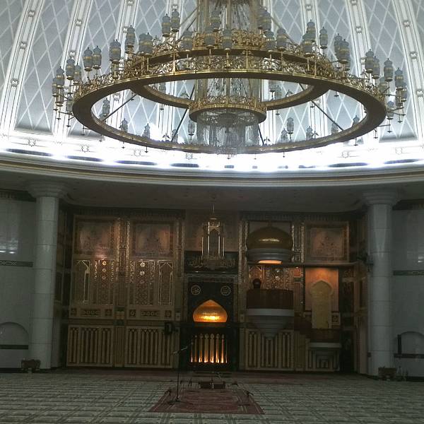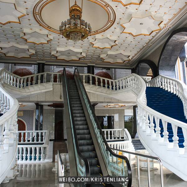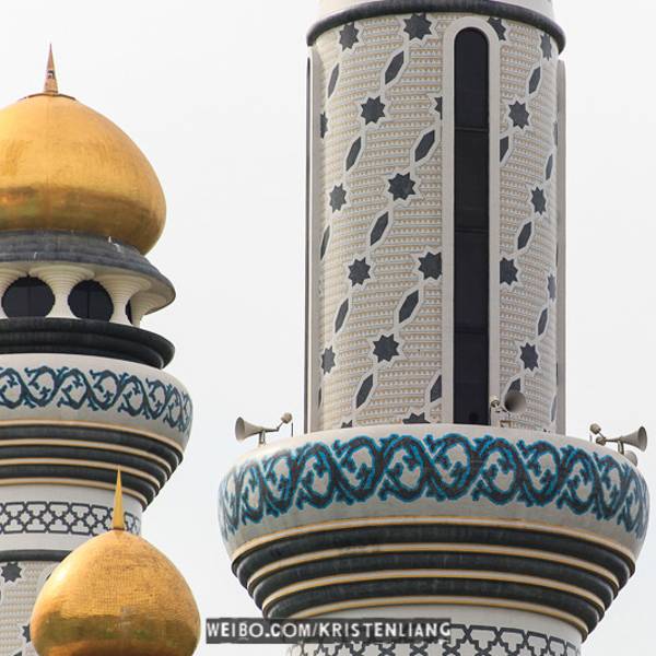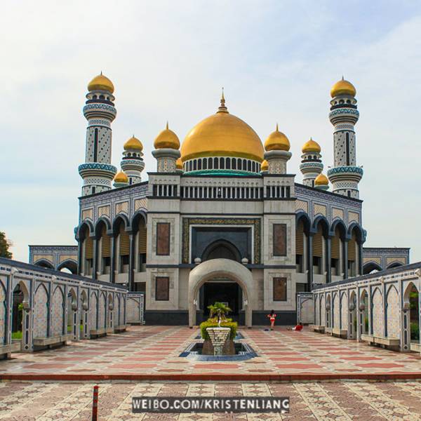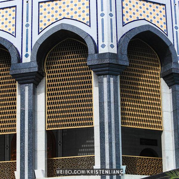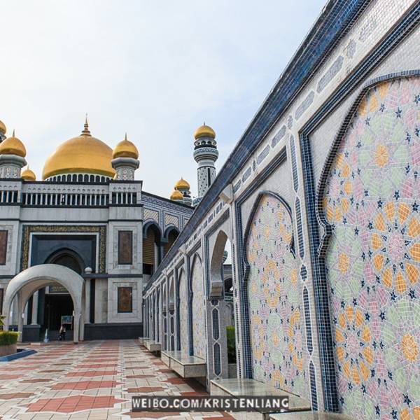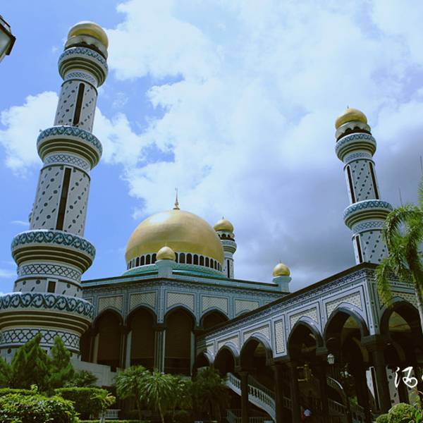 哈桑纳尔•博尔基亚清真寺(Jame Asr Hassanal Bolkiah)是文莱最大的清真寺,座落于斯里巴加湾市的哈桑纳尔•博尔基亚大道旁,由文莱现任苏丹个人捐献巨资修建,于1994年7月苏丹生日期间正式开放启用。博尔基亚清真寺规模宏大,由主体建筑和尖塔组成,主体拱顶与四周的尖塔均镀24k纯金,使得整座寺院显得华丽、壮观。主体拱顶是该寺耗费黄金最多的部分,也是最能显示该寺皇室气派的部分。屋顶内部其实是空心的,这减轻了它对主体建筑的压力。拱顶的内部饰有色彩艳丽的玻璃,既有装饰作用,又有采光之功用,明媚的阳光透过玻璃显得绚烂无比。据介绍,清真寺的29个金壁辉煌的圆顶是为了纪念历史上29个苏丹统治的朝代,4座57米高的塔尖装饰着蓝色和白色的马赛克,高高矗立,既肃穆又醒目。 清真寺内设有两个祈祷厅,共可容纳5000名穆斯林同时祈祷。除规定的祈祷时间外,游客可以进入清真寺参观。进入清真寺都要脱鞋,女士需要穿上寺内专备的黑色长袍。祈祷厅内指示着麦加方向的凹壁上装饰着黑色大理石和镀金瓷砖,男祈祷厅内有重达3.5吨的奥地利水晶吊灯,为整个大厅增添了豪华、堂皇、肃穆的氛围,据说厅内摆放着世界上最大的《古兰经》手抄本。 博尔基亚清真寺用料十分讲究,从闪闪发光的灯饰到光洁可鉴的大理石地面,都散发着浓郁的伊斯兰气息。每到黄昏,在夕阳的照耀下,金光闪闪的塔尖掩映在绿树和傍晚的云彩之间,诵经声悠扬而深远,一直响彻在人们的耳边。
