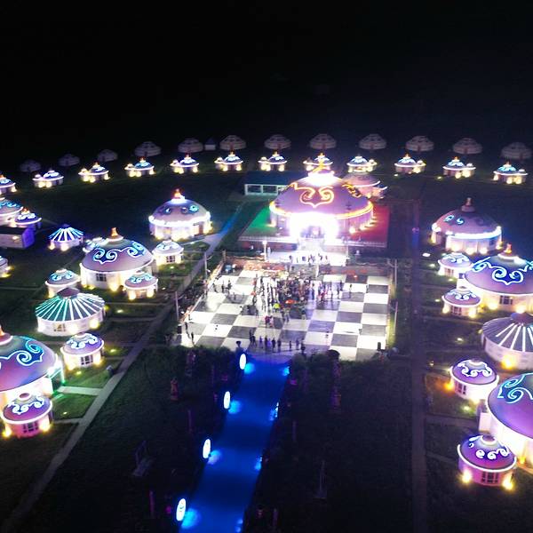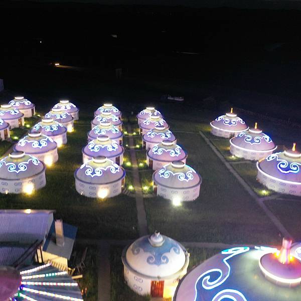 继续行程,不久后来到了入住的蒙古包:弘吉剌部;要司机小哥上午就定好的烤全羊(就在弘吉剌部蒙古包内),蒙古大包里面乌压压一大堆人,参与了烤全羊开光仪式,再点点其他的菜品,喝点小酒,个多小时就结束了;晚9点开始,部落举行篝火晚会,前坪烧个火,一堆男男女女围着篝火牵着手,在音乐声中跳起了小舞;篝火晚会上,还有烟花,感觉也挺漂亮的;蒙古包的灯光夜景,航拍起来,效果确实不错。