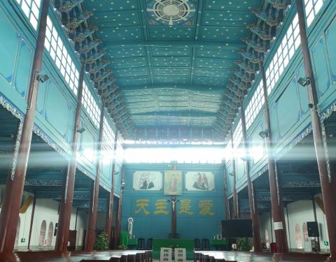 飞檐、斗拱和装饰都是东方的建筑特点,若不是这三个字和十字架,或许谁也不会把它和教堂联系在一起。