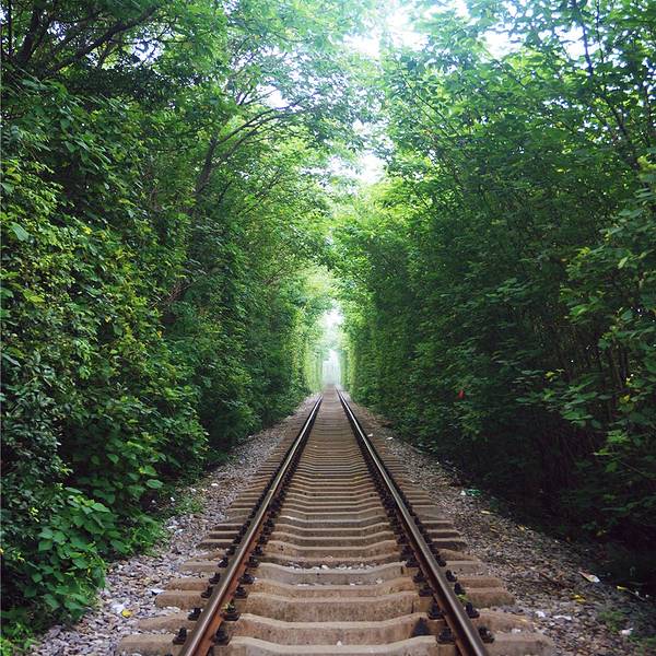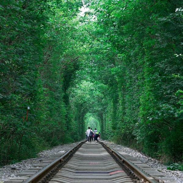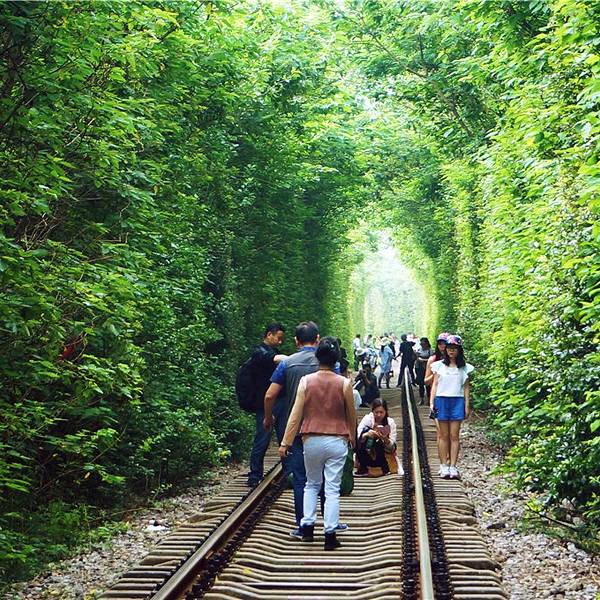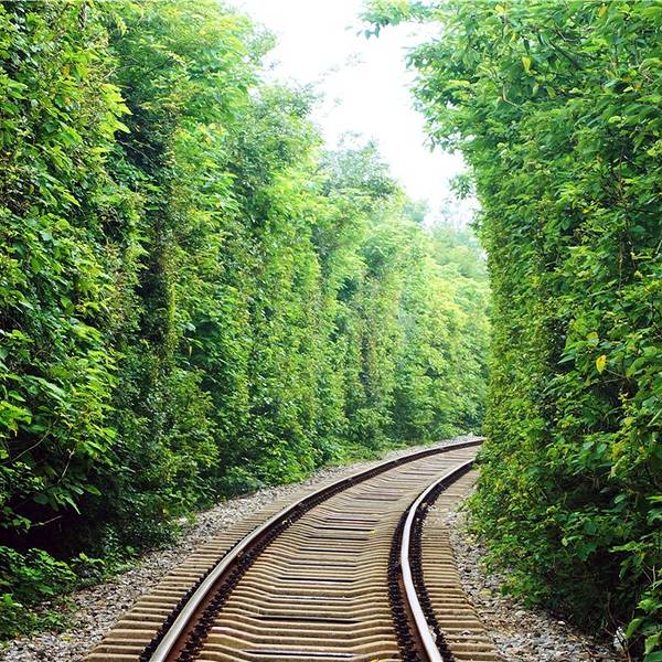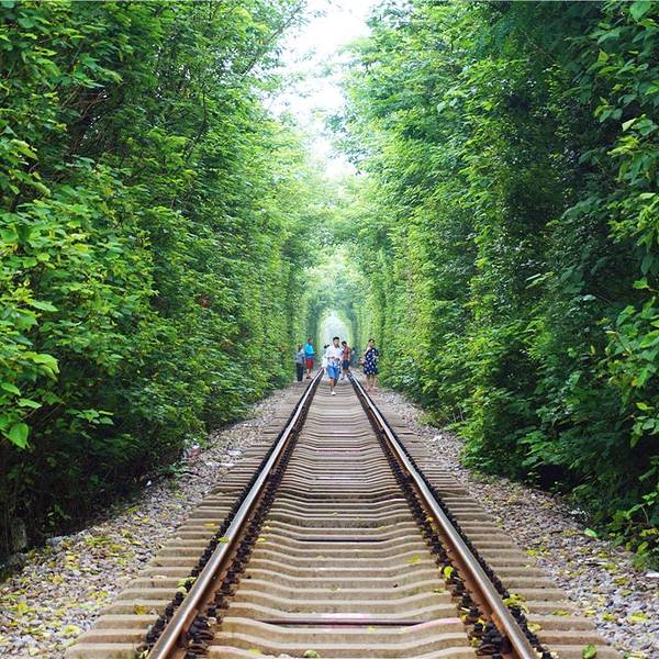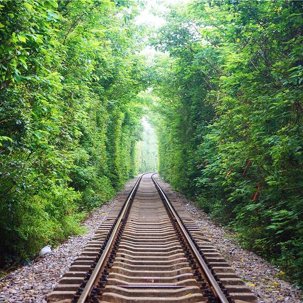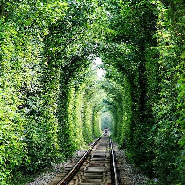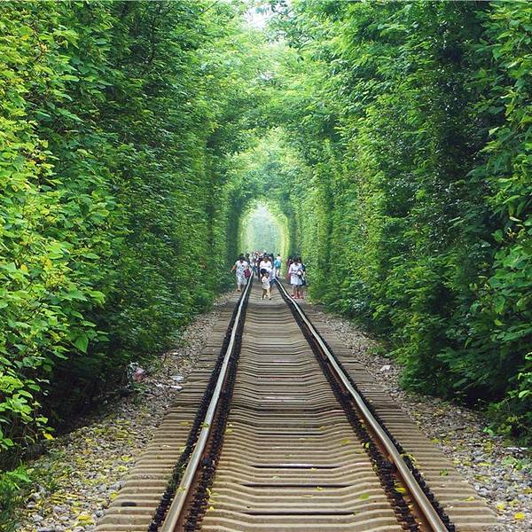 之前看到过一组乌克兰爱情隧道的图片:初夏,一条宁静的铁路,路边树木枝繁叶茂,连成天然“拱廊”,宛如仙境。这条绿色环绕的铁路,被称作“爱情隧道”。