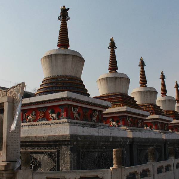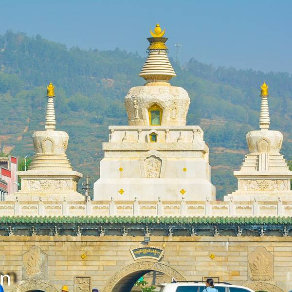 八宝如意塔位于寺前广场,是塔尔寺最独特的象征,八座塔造型大同小异,塔身白灰抹面,底座青砖砌成,...八宝如意塔位于寺前广场,是塔尔寺最独特的象征,八座塔造型大同小异,塔身白灰抹面,底座青砖砌成,腰部装饰有经文,每个塔身南面还有一个佛龛,里面藏有梵文。
