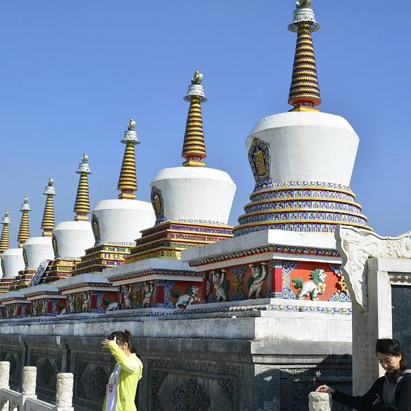 八宝如意塔是塔尔寺景区里的一个独特建筑,由八个塔组成,排成一排,很美、很壮观!都是藏族的建筑特色八宝如意塔是塔尔寺景区里的一个独特建筑,由八个塔组成,排成一排,很美、很壮观!都是藏族的建筑特色!白白的塔镶嵌在金碧辉煌的塔基上,独具魅力的艺术特色!