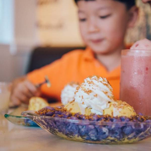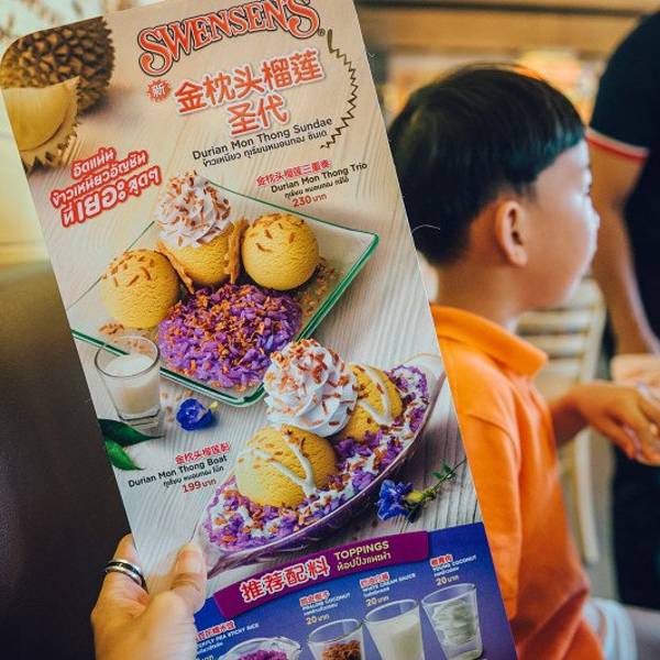冰淇淋店了~敲黑板!Swensen's的店员说这是他们推出的新口味!我瞬间就被秒杀了~啊,我最爱的榴莲啊榴莲~还有贴心的中文菜单,真是太贴心了,就连西门子自己都可以看图来点单了。一开始我还担心西门子吃不了榴莲,所以格外点了一份山竺思暮雪(Mangosteen Smoothie),这原本是给西门子点的饮料,没想到我喝了第一口就迷上了啊,酸酸甜甜的口感简直是夏日里的一股清流啊清流。于是,我又多点了一份给西门子~这还不是重点,重点是,西门子在吃了我和张雷蒙的金枕头榴莲船(Durian Mon Thong Boat)和金枕头榴莲三重奏(Durian Mon Thong Trio)之后他自己也迷上了。。黄色的榴莲冰淇淋和紫色的紫糯米在颜色上就堪称完美的搭配,加上白色的奶油,画面简直太美。100%榴莲制作的冰淇淋,配上香浓可口的蓝豌豆花糯米饭,浇上浓稠的奶油。。我们三个人第一吃冰淇淋吃到饱。。全当是一份完美的brunch了。。榴莲控绝壁不能错过啊~