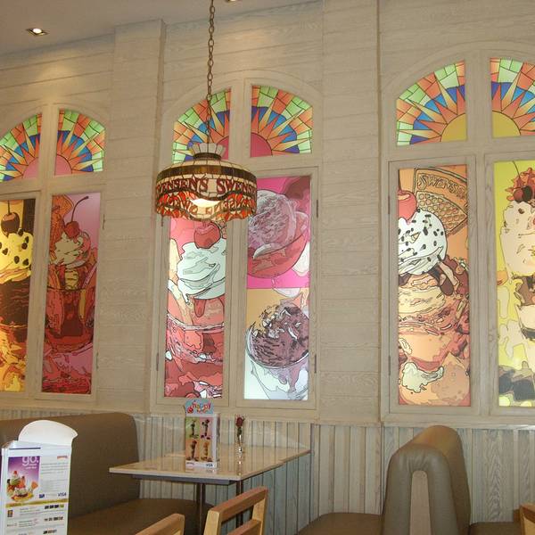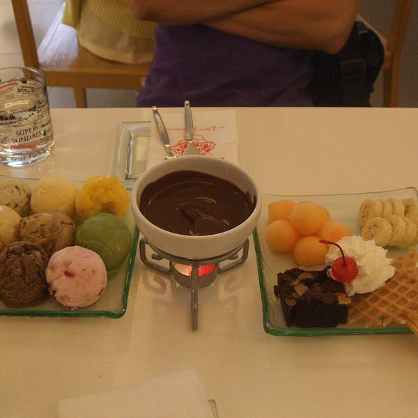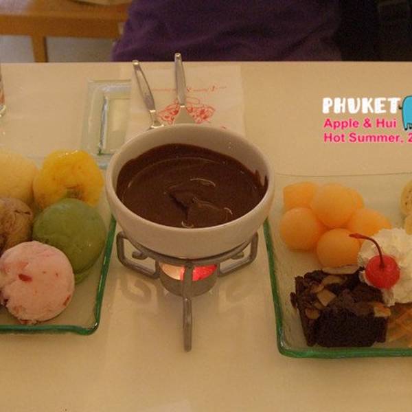 普吉的swensen's位于最热闹的巴东海滩最繁华的商场 Jungceylon门口,店铺的LOGO是粉紫色做底,雪糕图案加上swensen's字母做成,颜色鲜艳又够大,很好找。一进到店里,首先被雪糕店吸引的不是雪糕,是店铺内的装修,非常甜蜜有活力,已经紧紧抓住女性消费者的心:五彩缤纷的吊灯,加上自家各款主打冰淇淋做成墙上的装饰,整家冰淇淋店很活泼年轻的感觉,很受年轻人喜爱。而且,这里的座位宽敞舒适,环境舒服又干净。店里提供免费的白水,服务很好。这里的冰淇淋平价又美味,2个人点了一个雪糕火锅套餐,根据当时的汇率才70元人民币,比起在国内吃的哈根达斯雪糕火锅超级划算好几倍。雪糕火锅套餐,包括:一个巧克力酱火锅,2大碟材料,一碟是雪糕:9种口味的9个雪糕球,每个球都有甜筒单球那么大,每个味道都很好;另一碟是水果,华夫饼,饼干和cream。