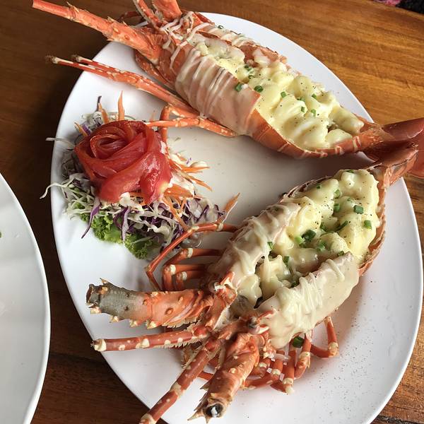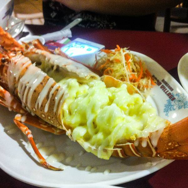 这家店在网上最出名,主要是有中文的招牌,老板会说一点中国话吧,当然,态度也是比较热情的。 这里代工一只龙虾是200B,其它的菜是50B一个吧,挺公道的,我们一起搞完再点饭呀、青菜也就400B这样,不过龙虾只有2种做法,一是芝士焗,一种是什么酱焗了,芝士是偏甜的,当然不能要了,就要后一种做法吧。然后旁边有点果汁的,芒果沙冰是40B,比PP岛上便宜呀。