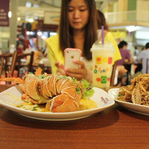 这里代工一只龙虾是200B,其它的菜是50B一个吧,挺公道的,我们一起搞完再点饭呀、青菜也就400B这样,不过龙虾只有2种做法,一是芝士焗,一种是什么酱焗了,芝士是偏甜的,当然不能要了,就要后一种做法吧。然后旁边有点果汁的,芒果沙冰是40B,比PP岛上便宜呀。