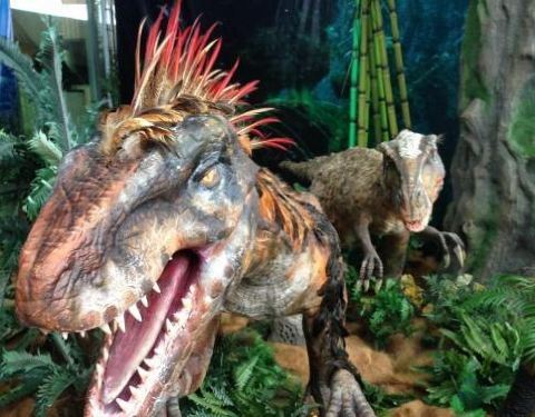 在游乐园边上,门口有个巨大的恐龙,很醒目。