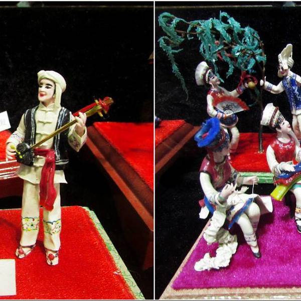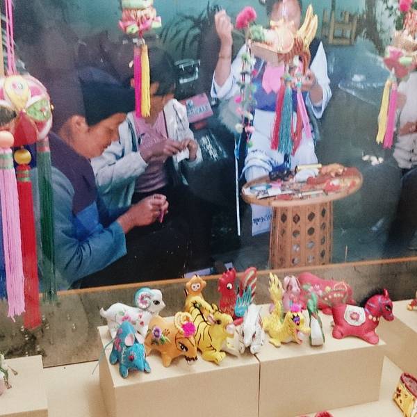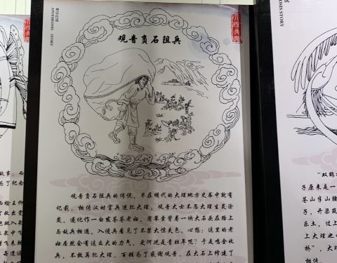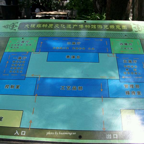 门口进去是一个院子,主要为游客休息的地方;然后穿过一个过廊,里面主要卖旅游工艺品处,就是然后就到蒋公祠了。根据路标指引,进入到左边的第一个主题为神的传说、传统技艺、本主文化的展厅;第二个展厅主要介绍白族剪纸、白族面塑、甲马纸、刺绣;第三展厅为白族绕三灵、民居彩绘、扎染;第四展厅为下关沱茶;第四展厅介绍项目传承人、传统音乐和舞蹈。