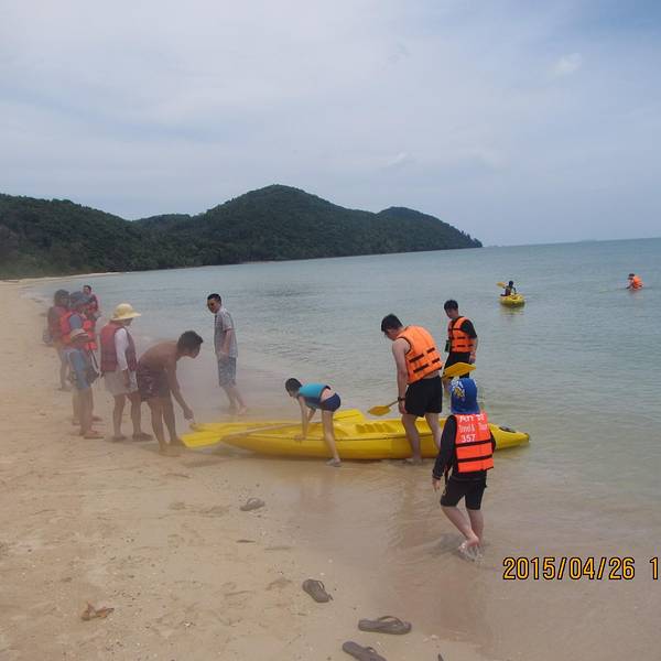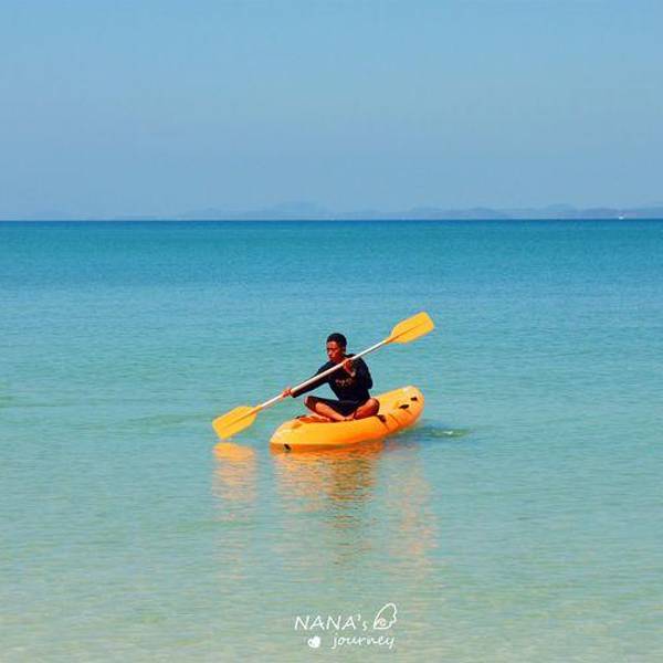 这几张是等候时的码头,领队挺幽默的,曼谷小黑,中文不错,除了领队以外有不会中文或英文的船长一人,一直站在船头船尾的工人两人。船上都是国人,应该都是预订来的,如果英语好的,也可以到了当地再预订,路边...这几张是等候时的码头,领队挺幽默的,曼谷小黑,中文不错,除了领队以外有不会中文或英文的船长一人,一直站在船头船尾的工人两人。船上都是国人,应该都是预订来的,如果英语好的,也可以到了当地再预订,路边有很多一日游的小车。这一天的行程基本都是为孩子来的,所以几乎每家一孩,船上免费提供饮料,有果汁、汽水、矿泉水,船上有保温箱,就是这个蓝色大箱子,里面有冰,随便拿管够。水果是只提供一次,应该都是在下午返程的时候提供。这个时候建议大家一定保存体力,别管晕不晕船,提前吃一个晕车药,要不然一整天人都会觉得不舒服。我是不晕船的,但是保险起见也吃了一粒。中午时分到达第一站,大长岛,船上有小两口预订的这里的酒店,酒店挺美的,但是肯定是购物不方便,住的人也少,想清净的可以住在这里,一日游行程就是可以把你送到这解散,你住到哪天,在跟着哪天的团回来继续下午的行程,所以不用担心交通问题。船开了大概半个小时,到达大长岛,午饭在这里吃,吃饭前的活动是到酒店的泳池里学习浮潜,或者愿意去海边游的也可以。但是中午还是蛮晒的,大部分人都不能坚持泡在海水里,提示大家一定要做好防晒工作,男士也不要只顾着玩帅在太阳下暴晒哦。最标准配置是遮阳帽、长袖防晒衣、尽量想法护颈、沙滩袜,不少人在下午已经被晒伤或者被碎珊瑚、礁石划伤。午饭在这里吃的,饮料、水果不限量,米饭随便吃,十个人一桌,菜不够还可以加,但是我看基本没吃完,主要风格做的不是太可口,每家都有孩子,有些菜还是辣的。吃完饭,大家可以轮流玩皮划艇。