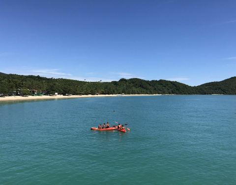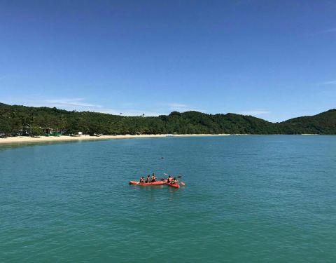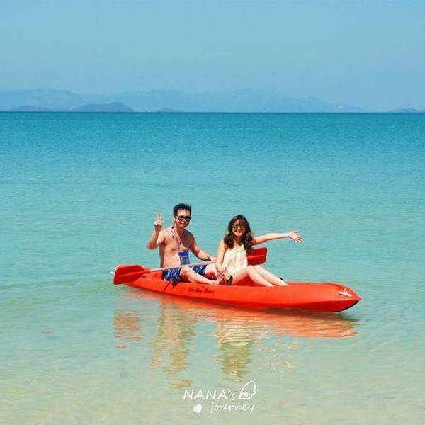 这几张是等候时的码头,领队挺幽默的,曼谷小黑,中文不错,除了领队以外有不会中文或英文的船长一人,一直站在船头船尾的工人两人。船上都是国人,应该都是预订来的,如果英语好的,也可以到了当地再预订,路边有很多一日游的小车。这一天的行程基本都是为孩子来的,所以几乎每家一孩,船上免费提供饮料,有果汁、汽水、矿泉水,船上有保温箱,就是这个蓝色大箱子,里面有冰,随便拿管够。水果是只提供一次,应该都是在下午返程的时候提供。这个时候建议大家一定保存体力,别管晕不晕船,提前吃一个晕车药,要不然一整天人都会觉得不舒服。我是不晕船的,但是保险起见也吃了一粒。中午时分到达第一站,大长岛,船上有小两口预订的这里的酒店,酒店挺美的,但是肯定是购物不方便,住的人也少,想清净的可以住在这里,一日游行程就是可以把你送到这解散,你住到哪天,在跟着哪天的团回来继续下午的行程,所以不用担心交通问题。船开了大概半个小时,到达大长岛,午饭在这里吃,吃饭前的活动是到酒店的泳池里学习浮潜,或者愿意去海边游的也可以。但是中午还是蛮晒的,大部分人都不能坚持泡在海水里,提示大家一定要做好防晒工作,男士也不要只顾着玩帅在太阳下暴晒哦。最标准配置是遮阳帽、长袖防晒衣、尽量想法护颈、沙滩袜,不少人在下午已经被晒伤或者被碎珊瑚、礁石划伤。午饭在这里吃的,饮料、水果不限量,米饭随便吃,十个人一桌,菜不够还可以加,但是我看基本没吃完,主要风格做的不是太可口,每家都有孩子,有些菜还是辣的。吃完饭,大家可以轮流玩皮划艇。