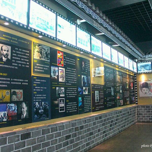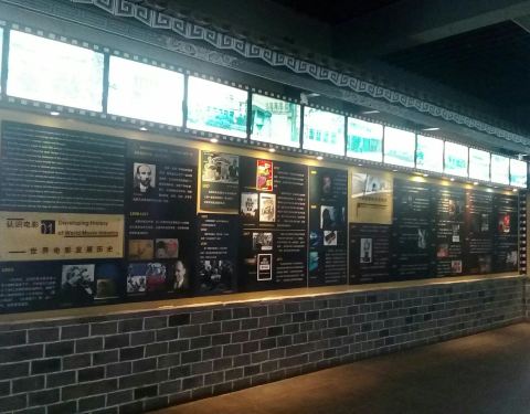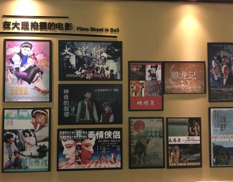 进门第一个展厅有供游客休息的地方,分别写着世界电影、中国电影以及大理电影的发展史和各优秀影片的宣传画。