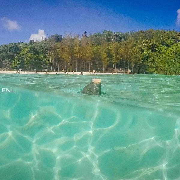 岛距离比较近,所以包船的话一般是两个岛打包起来玩。我们当时是6个人包船,从通赛湾往返,玩一下午,一个人约200人民币左右。船上有水,水果,浮潜用具等等,同时船家帮我们付了该岛的登岛费。竹子岛的海滩在大皮皮岛周边来说,算是很不错的,而且距离上很近,有优势,所以很受游客欢迎。虽然我们去的时候是阴天,但是也能够看到海水水质不错,挺透的,沙滩的沙子很细,不咯